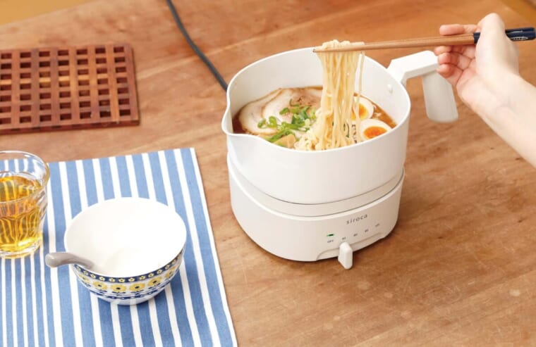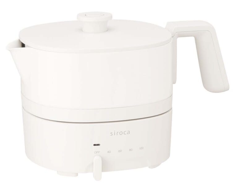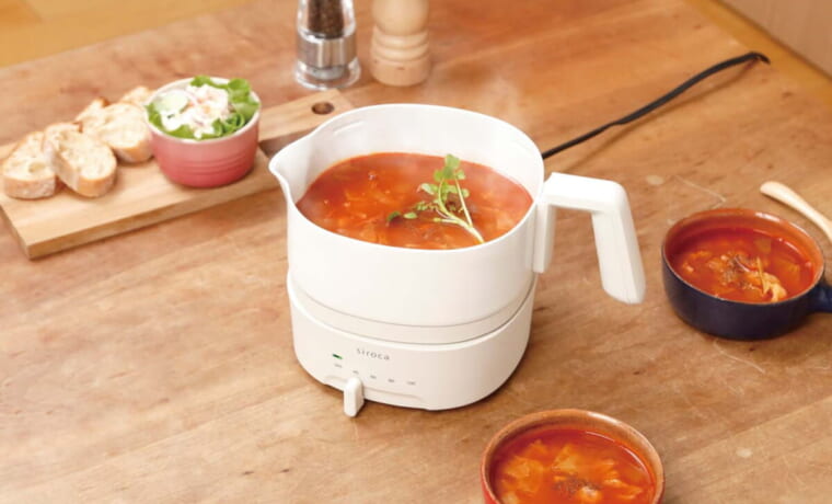湯沸かしはもちろん、鍋として汁物調理が行える電気ケトル。温度は40~100℃まで無段階で調節でき、スープを温めたり、インスタントラーメンを直接入れて作ったりと用途が広い。容量1Lで、ひとり鍋などにも最適だ。