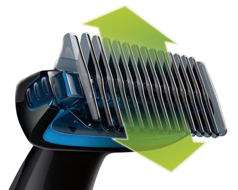 ヘッドにスキンプロテクターを装着した全身用トリマー。刃が肌に直接触れないためデリケートな部分を傷つけず、快適に0.5mmの長さに整えられる。ゴム製グリップを採用し、濡れた手でも持ち手が滑らず安定してトリミング可能だ。