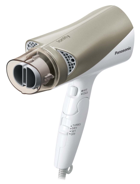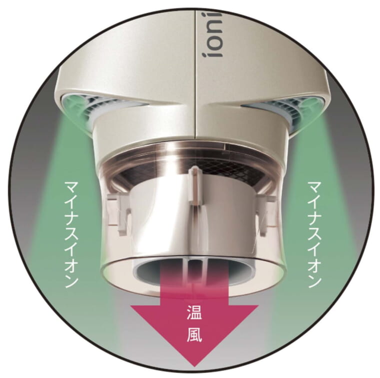 1.9m3/分の大風量で髪を素早くドライ。温風と冷風を交互に当てる機能に加え、髪の表面をコートするマイナスイオン機能で、髪を艶やかに仕上げる。髪の帯電を逃し、マイナスイオンを付きやすくするイオンチャージパネルも搭載。