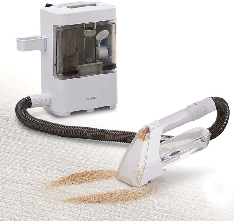 布類の汚れに水を吹き付けて汚れを落とす布専用掃除機。40°Cまでの温水を注入可能で、ハンドツール先端に搭載のブラシでこすり洗いもできる。カーペットやソファ、カーシートの手入れに最適。小型サイズで家中どこでも使える。