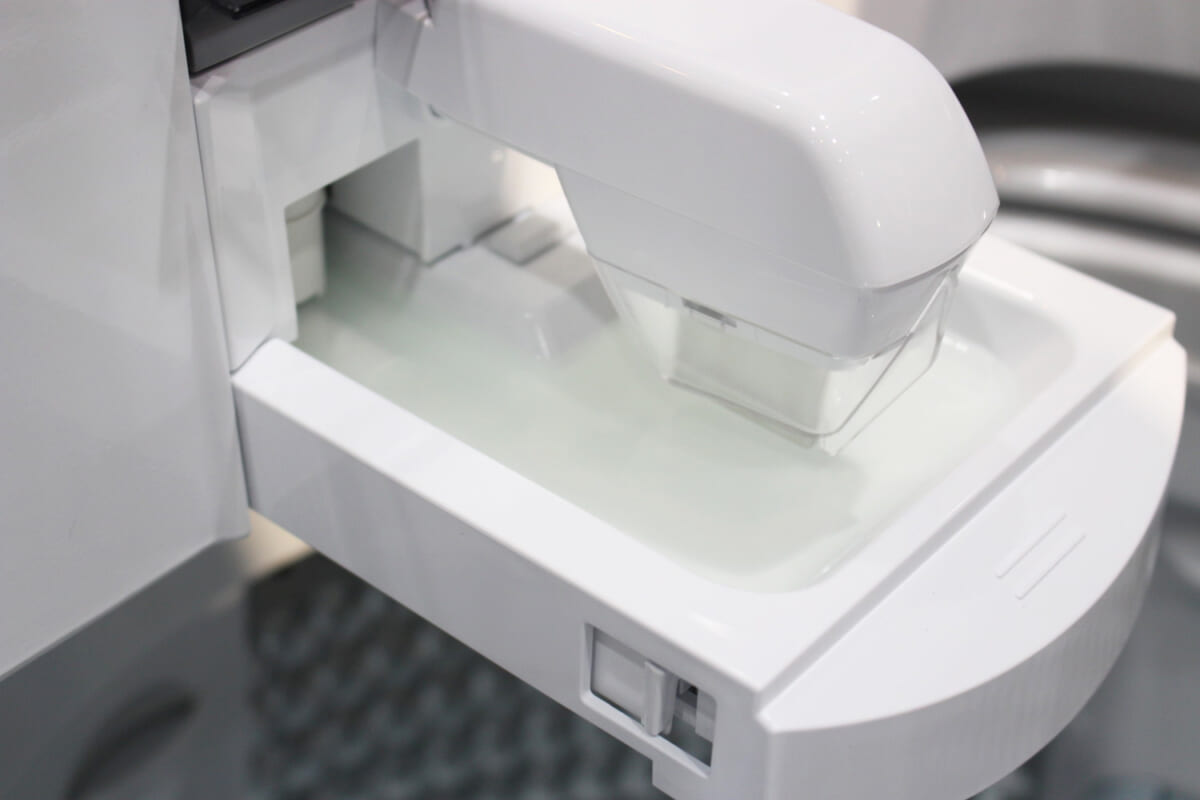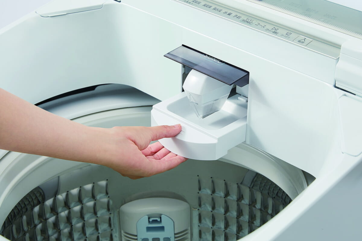 この「らくらくSONIC」の機構を可能としたのが、もうひとつの新機能「液体洗剤・柔軟剤の自動投入」。あらかじめ液体洗剤(タンク容量約800ml)、柔軟剤(タンク容量約780ml)の詰め替え用パウチを丸ごと1本入れておけば、洗濯のたびに適量を自動投入してくれるので、洗剤を入れる手間や入れすぎのムダが省けます。他メーカーではすでに導入が進んでいるトレンド機能で、超音波ユニットと一体化したのは業界初。これにより洗剤液を洗濯だけでなく、部分洗いの際も自動で洗浄液が投入される仕組みを実現しました。