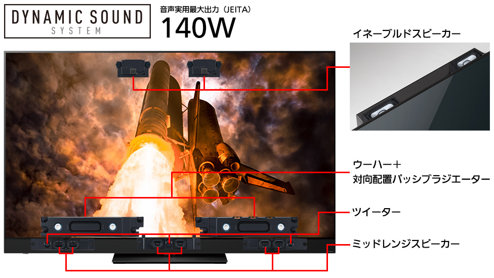 音質面では迫力の立体音響を実現するため、テレビ背面上部に上向きに配置した「イネーブルドスピーカー」を含む計15スピーカー/最大出力140Wのスピーカーシステムを搭載。これを、立体音響技術「Dolby Atmos」に対応した音声処理回路で駆動することで、上下左右から音に包み込まれる迫力の立体音響を楽しめます。