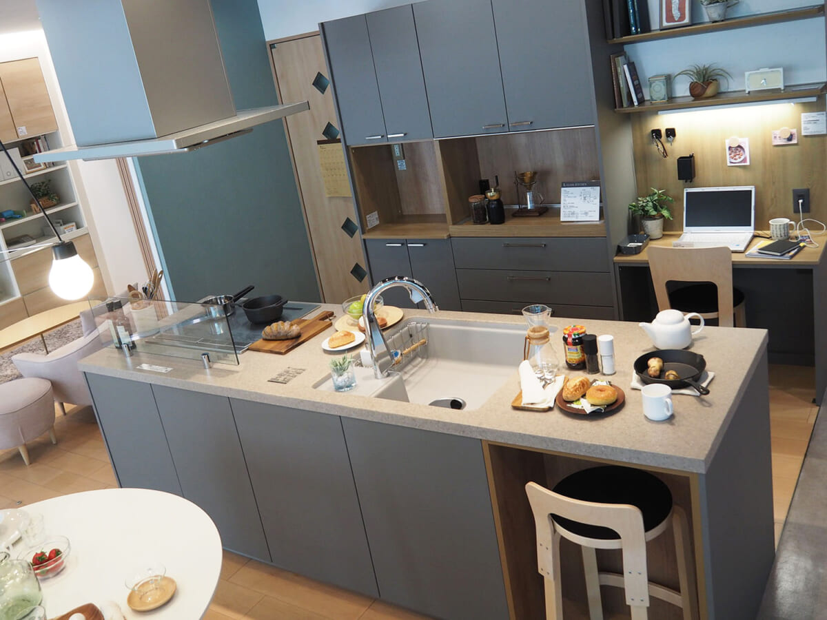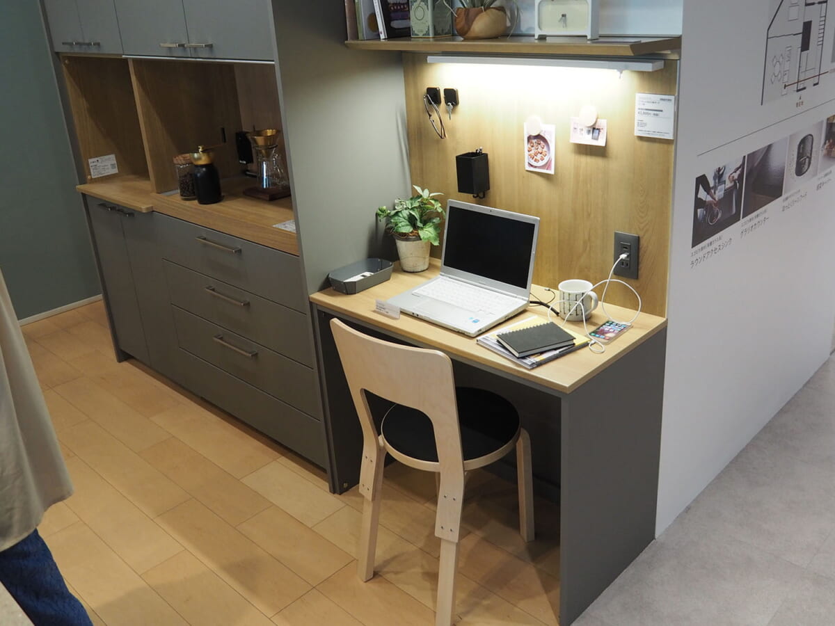 まず目を引くのが、キッチンなのにパソコンスペースがあること。現在、コロナ禍でリモートワークを続けている人もいますが、狭い住宅環境では「自宅でパソコン作業できるスペースはリビングの机だけ」ということもあります。とはいえ、毎日夫婦二人で一日中同じ机に向かっているのも気詰まりになりかねません。パナソニックは、そういった場合にキッチンにワークスペースを作ることを提案しているのです。