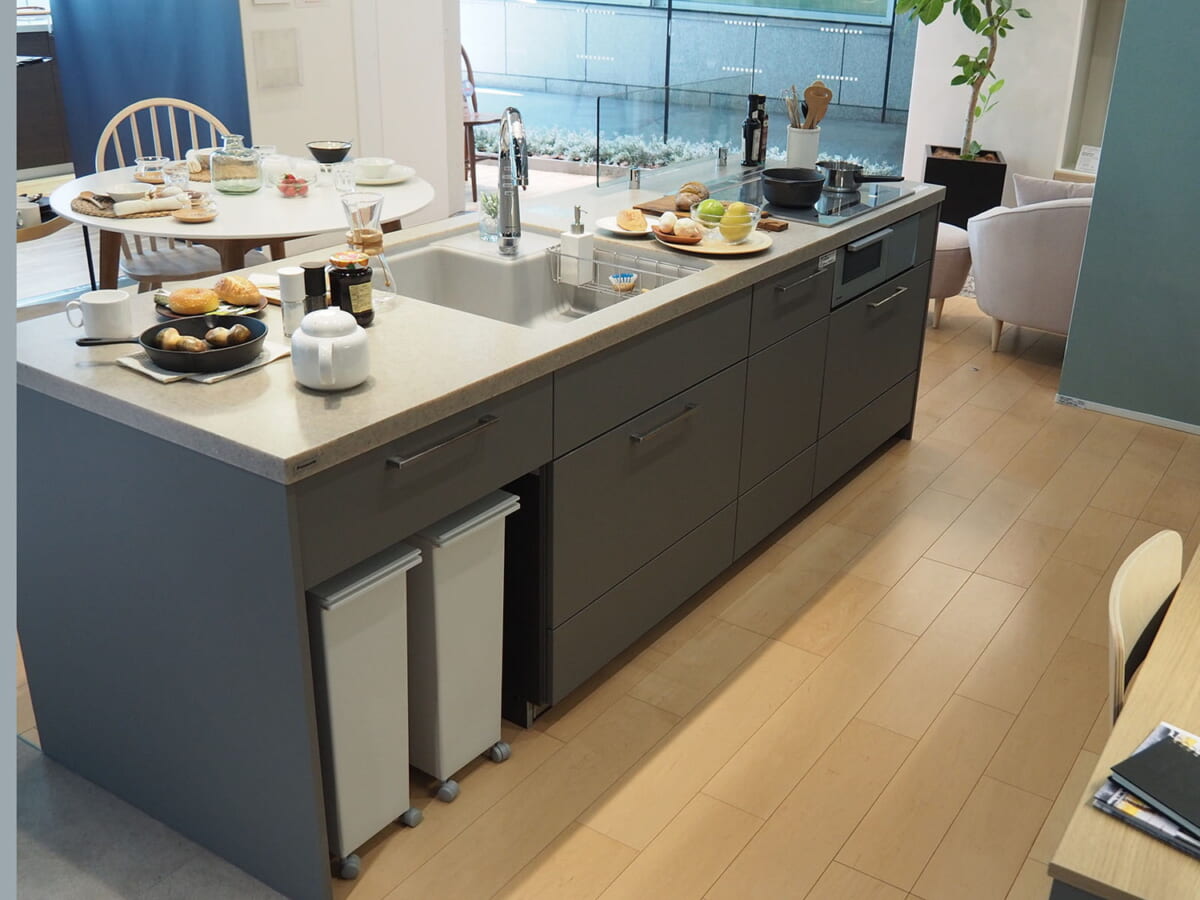 Idobata スタイルはさまざまなオプションがつけられますが、今回取材した展示プランには食洗機も搭載されていました。食洗機は扉部分を2回ノックするとフルオープンするタイプ。扉にベタベタ触れる必要がないので、自動水栓と同じく清潔に使うことができそうです。