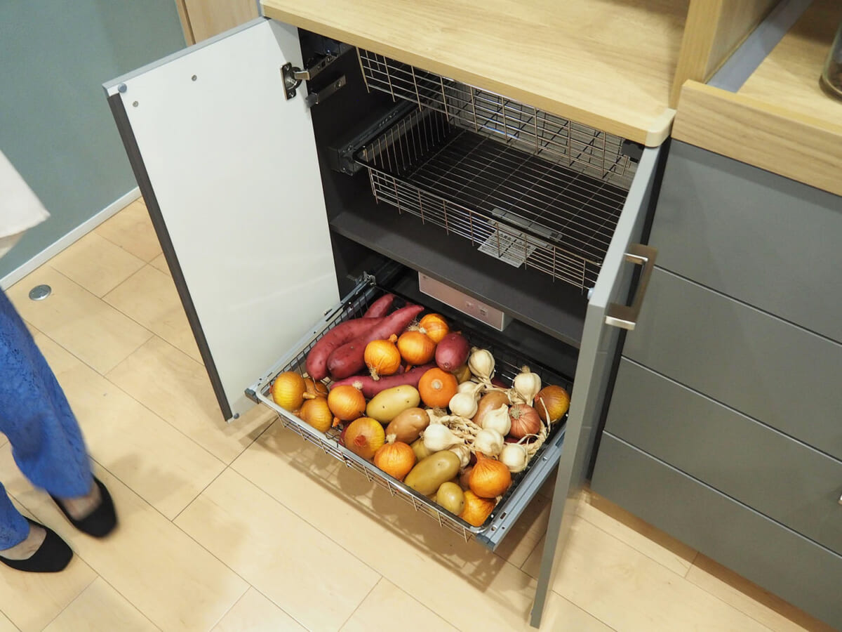 もうひとつパナソニックらしいと感じたのが、カップボード内に配置されていたナノイー搭載の食品庫「根菜キーパー」の存在。なんとカップボード内にパナソニック独自の微粒子イオン「ナノイー」を発生させる装置を内蔵。ナノイーをファンで庫内に充満させることで、根菜に発生するカビを抑制します。
