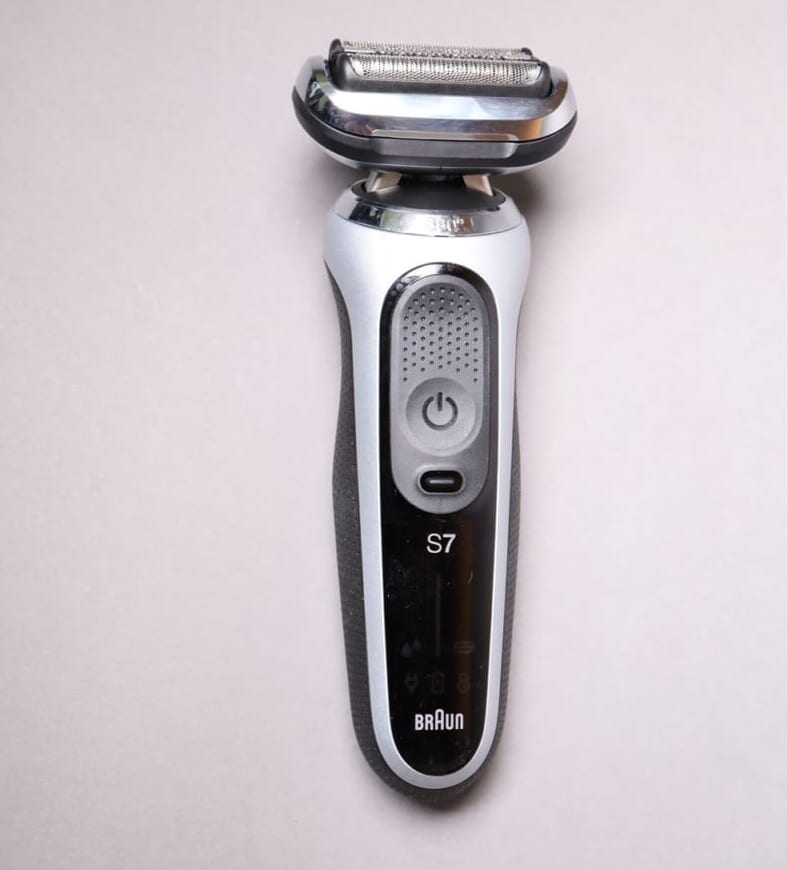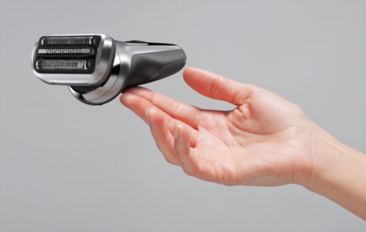シリーズ7を実際に使ってみると、まずはその軽さに驚きます。物理的な軽さと、握りやすさ、そして重心がちょうど親指と人差し指で握る部分にあるので、筆者が使っている4枚刃モデルよりかなり軽く感じます。筆者はヒゲが濃いのでシェービングに時間がかかるのですが、これなら長時間シェービングしても腕が疲れません。3枚刃のヘッドは大きすぎず小さすぎずの絶妙なサイズ。3連密着ブレードと360°密着システムが加わって、顎下ラインにピッタリと吸い付きます。網刃の滑らかさは特筆もので、内刃の鋭い切れ味と相まってスムーズに肌の上を滑っていく感触は良好。筆者のような濃いヒゲでも、短時間で深剃りできました。