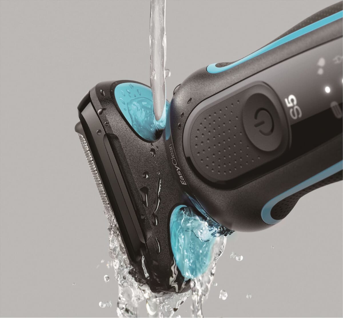 それでは各シリーズの特徴を見ていきましょう。シリーズ5は、ヘッドは固定して動かないものの、3連ブレードがそれぞれ4-5mmほど自在に浮き沈みすることで、ヘッドが肌の凹凸に合わせて密着する仕組みです。また、ヘッドを支えるネックの両側には穴が空いており、そこから直接水道水を流し込むことで、網刃を外さずにヘッドを簡単に水洗いできる「クイック洗浄システム」を採用。ヒゲを剃るたびにすぐに水洗いできるので、清潔さが保てます。なお、穴の中には水圧で開く弁があり、ヒゲ剃り中は閉じているので、シェービング中に細かなヒゲくずがこの穴から落ちることはありません。