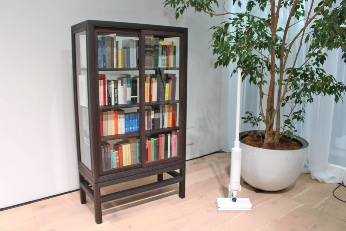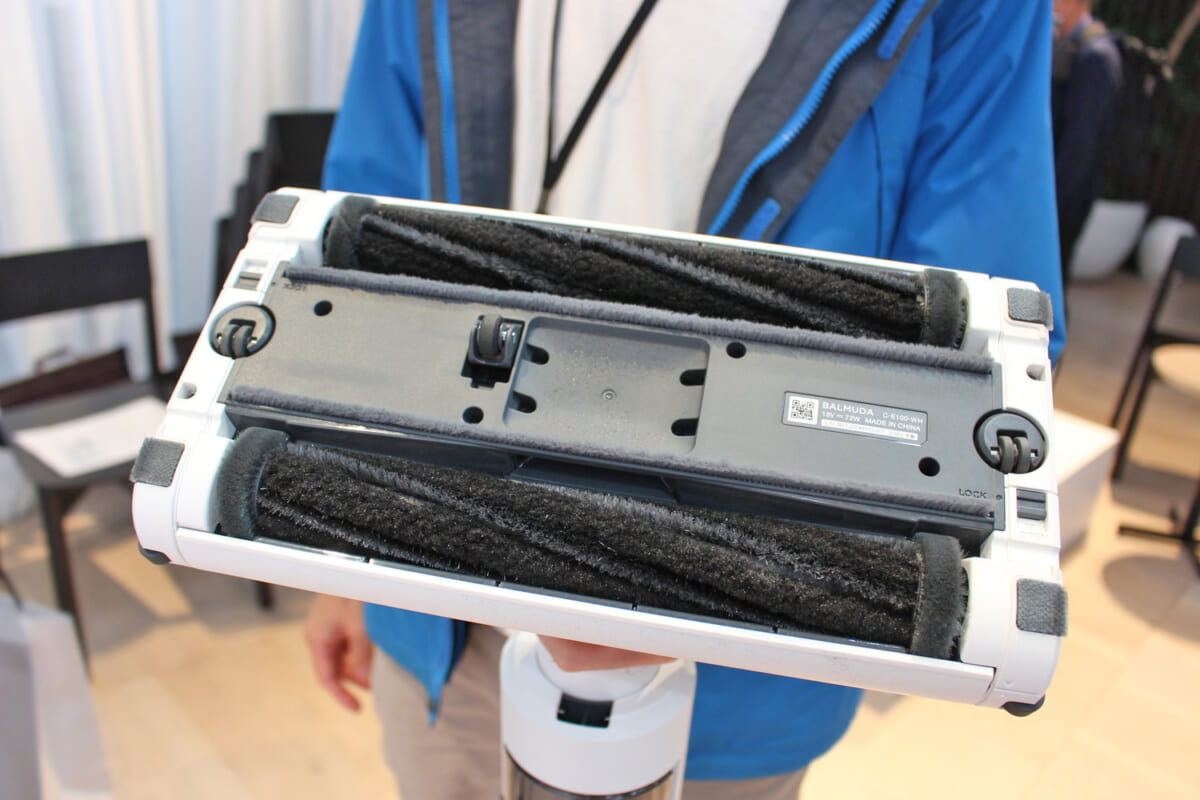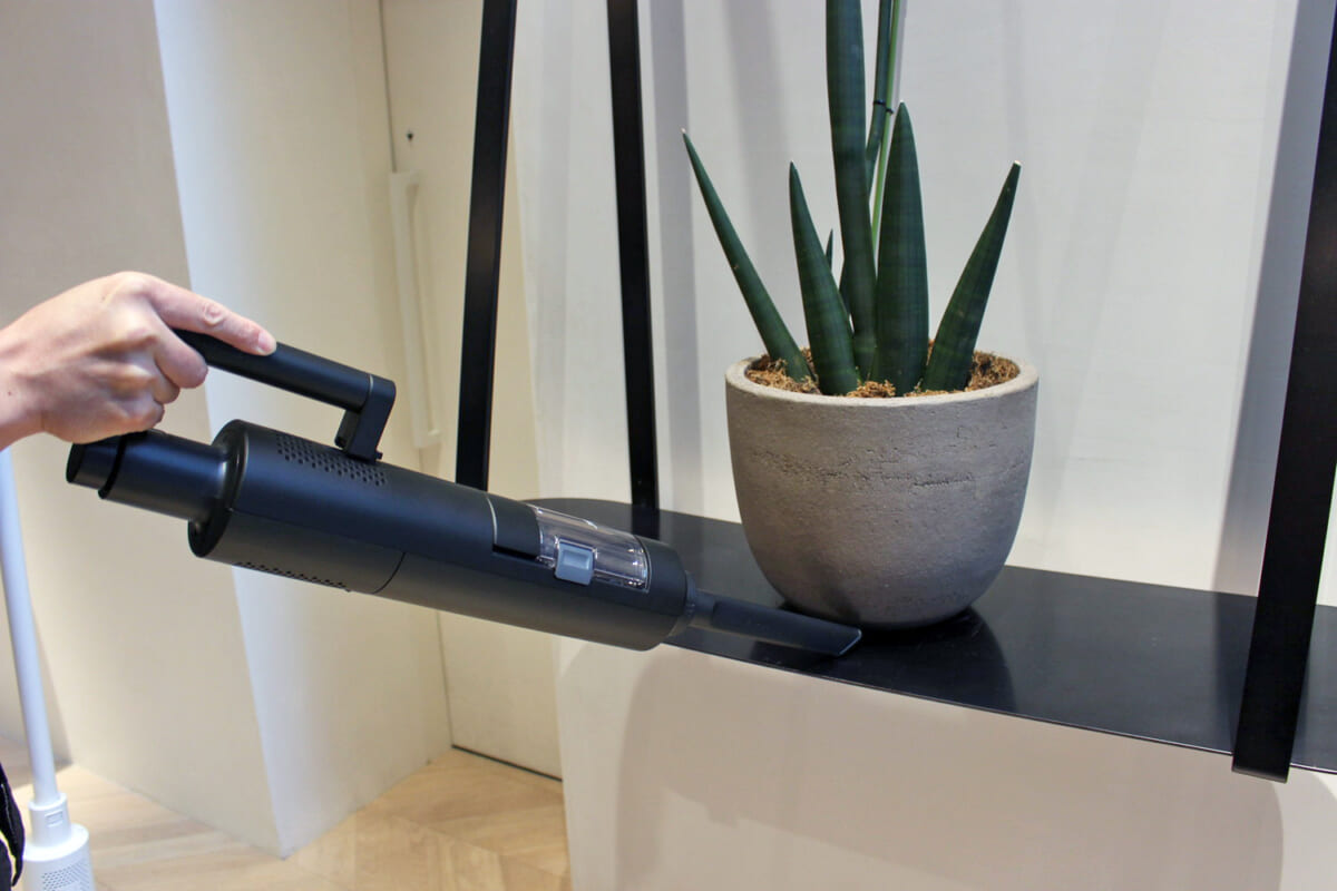 同社らしいデザインの美しさも健在。立てかけられた1本のほうきのように自然な姿を目指したといい、付属のスタンドは最も美しい角度で立てかけられるよう設計したとのこと。運転音についても、「作ってみたら意外と静かだった。デュアルブラシヘッドの効果で空気の流通が速いのではないか、と開発チームは推測をしている」(寺尾社長)といいます。