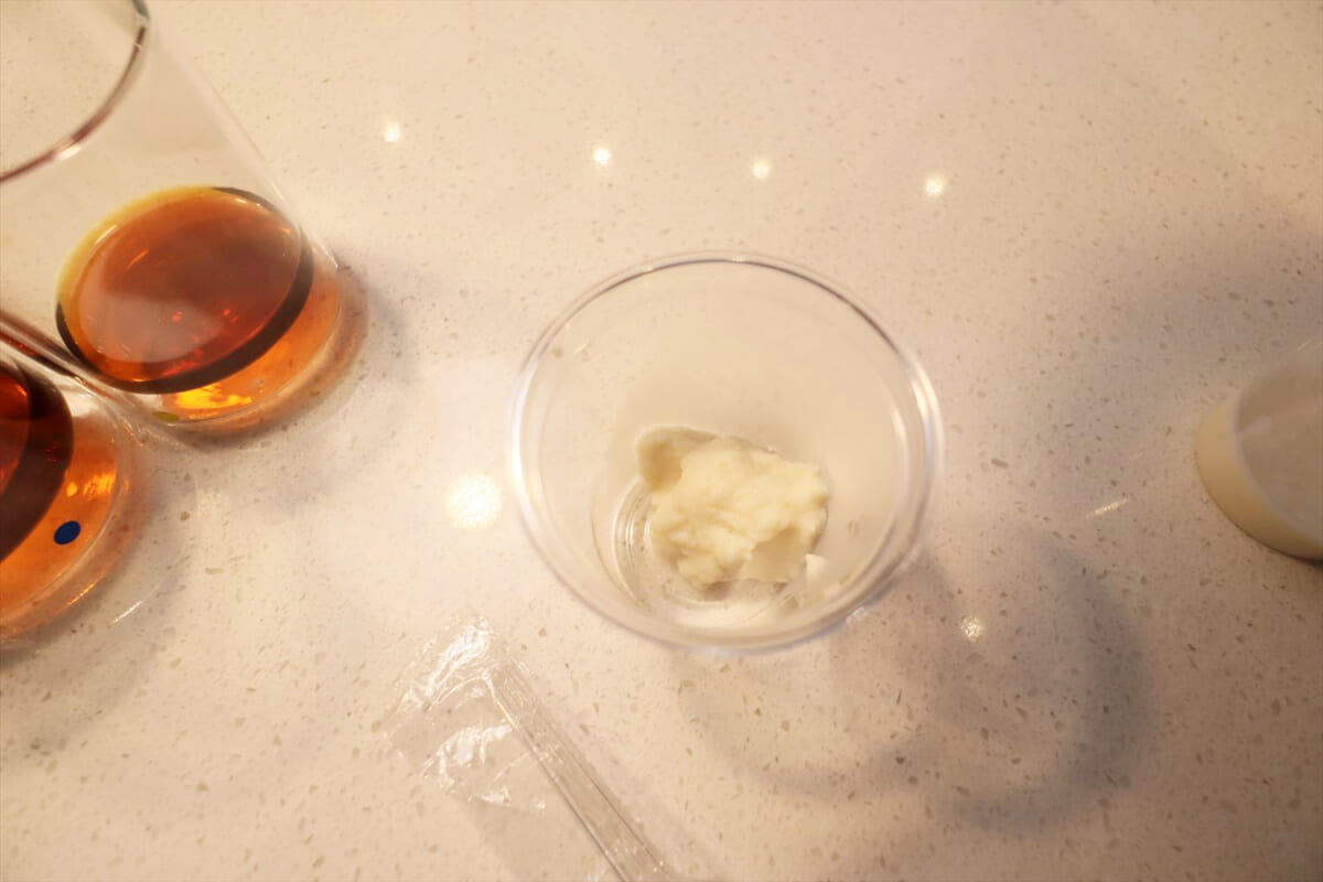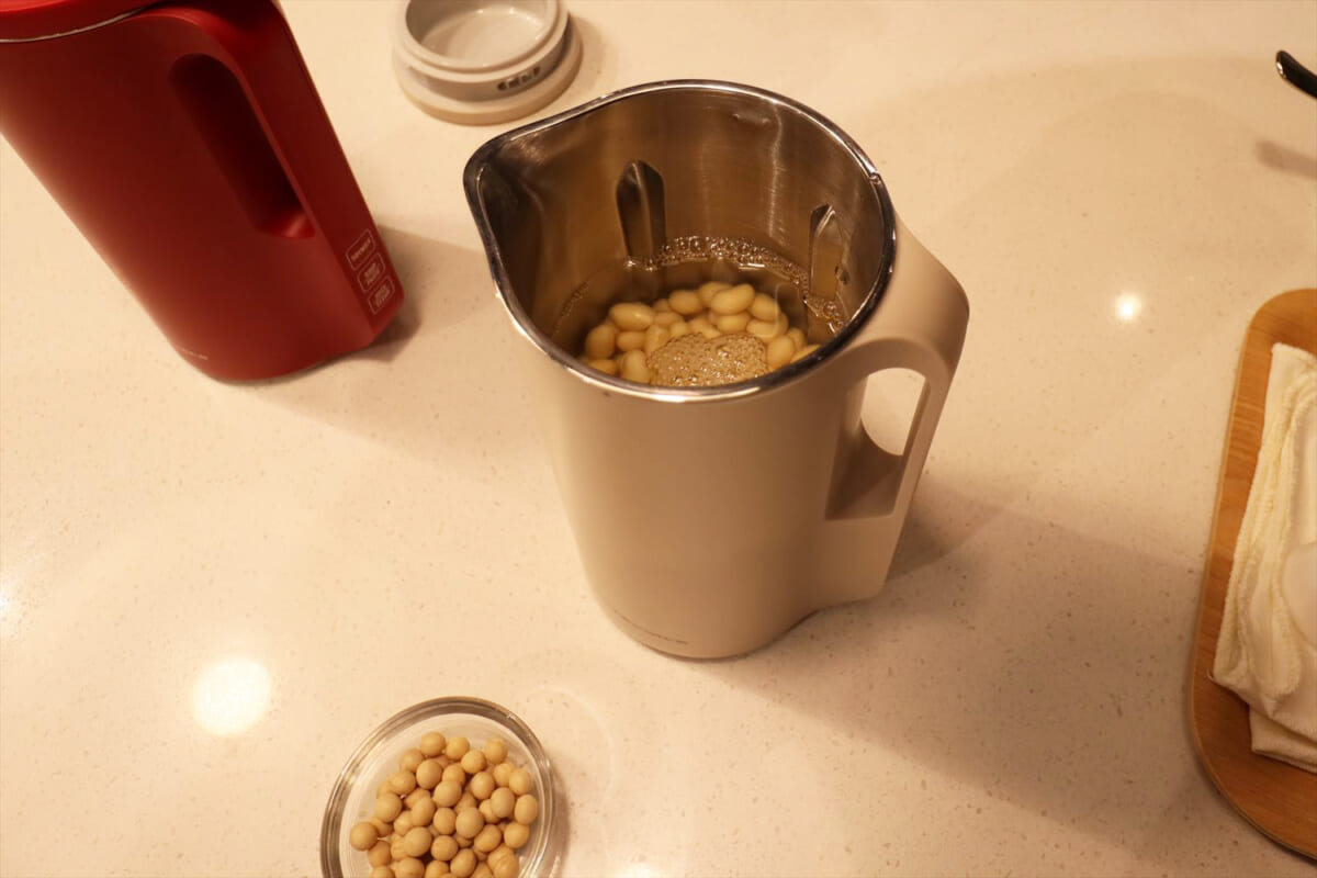 試飲会では作りたての豆乳を試すことができました。豆乳を作るときに使うのは乾燥大豆で、加熱済みの水煮缶は使用できません。乾燥大豆は、半日程度を水にさらしておくと味が出やすくなりますが、乾燥したままでも調理できます。水にさらす場合は付属のスプーンで2杯分(約40g)、乾燥したままならば2杯半(約50g)の大豆を使い、大豆をブレンダーの中に入れたらMAX線まで水を入れて(350ml)、「SOYMILK」ボタンを押して30分程度待つだけ。