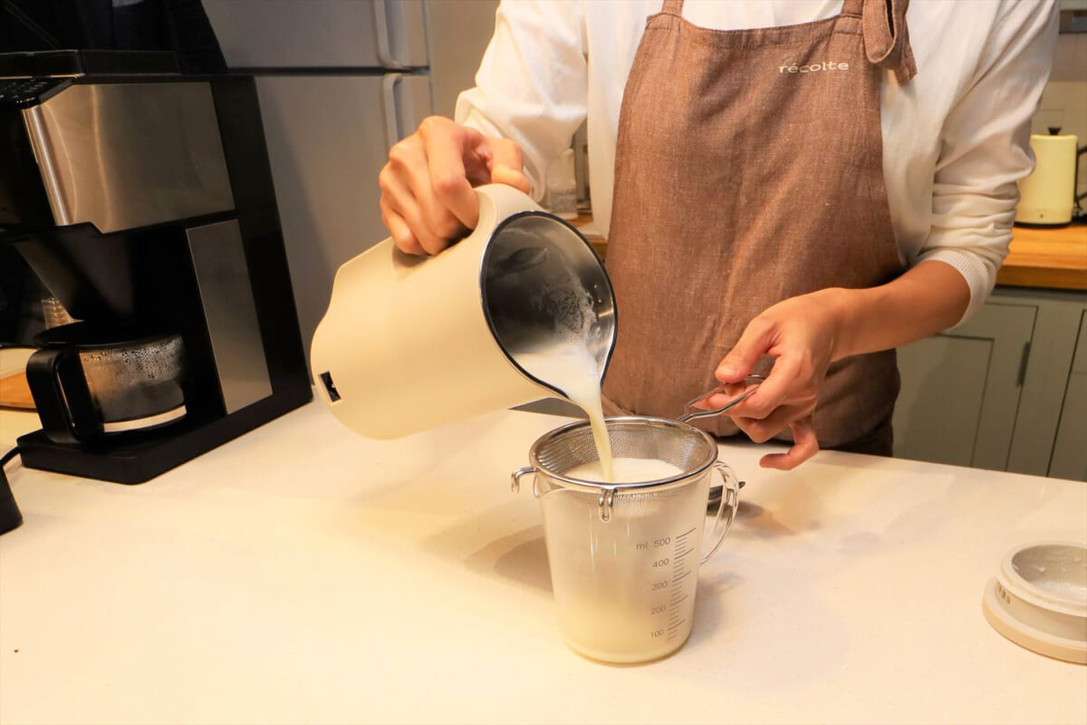 出来上がったら豆乳とおからを分離するために中身を濾します。濾すときは茶こしや目の細かいザルを使えばOKだそう。きめ細かい豆乳が飲みたいならキッチンペーパーかさらし布を使えばいいとのこと。