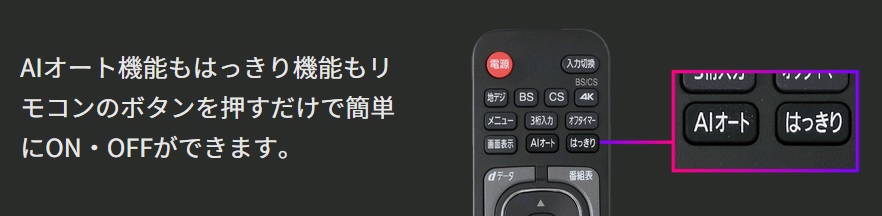 新モデルでは、ドラマやスポーツ、ニュースなど、テレビ番組の内容に応じて画質や音質を自動調整する「AIオート」機能と、映像や音声を強調させて見やすく・聞き取りやすくする「はっきり」機能の2つの調整機能を搭載。いずれもリモコンからワンボタンでオン/オフを切り替えることができます。