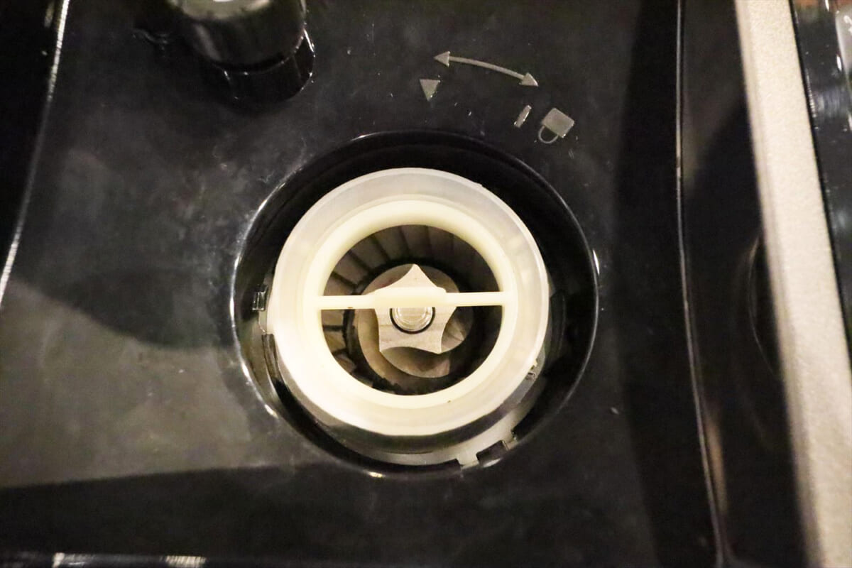 この細かな調節を可能にしたのが、コーン式ミルの採用です。円すい状のねじれた刃で豆を切り刻むコーン式は、粒度調節の精度が高く、挽き目はほぼ均一になるので雑味が少ないのが特徴。また、低速回転ながら短時間で挽けるため、熱によるコーヒーの劣化が少ないという利点もあります。