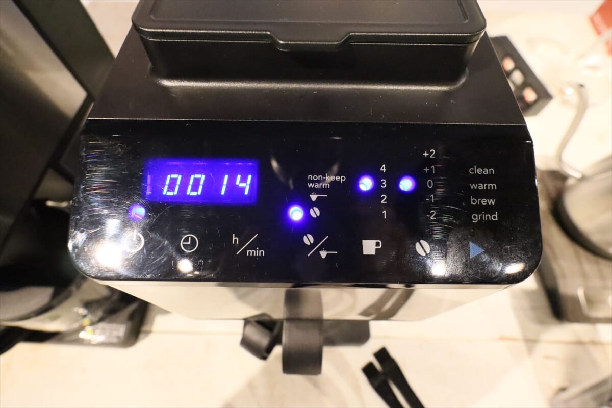 豆の量も調節可能。デフォルトは1杯分10gですが、10%ずつ2段階に増減できます。これにより、細挽き/豆の量+2にすればどっしりとした味わいに、極細挽き/豆の量-2にすればスッキリした味わいに、というように、挽き目の調節とかけ合わせることで、より細かく自分好みの味・コク・香りを探求することができるのです。