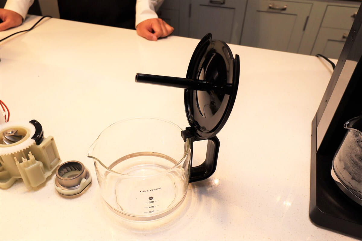 抽出されたコーヒーをためるポットには、対流式のガラスポットを採用しています。これは、抽出されたコーヒーが上から落ちる間に空気に触れて温度が下がり、ポットの中でコーヒーの味と温度にムラができるのを防ぐため。対流式ポットだと、ポットのふたの中央の細長い管を通ってコーヒーが底に向かうことで温度が下がりにくくなり、さらに、底部のヒーターで温めることでポット内部に対流を起こし、コーヒーの温度ムラと味ムラを防ぐという仕組みです。