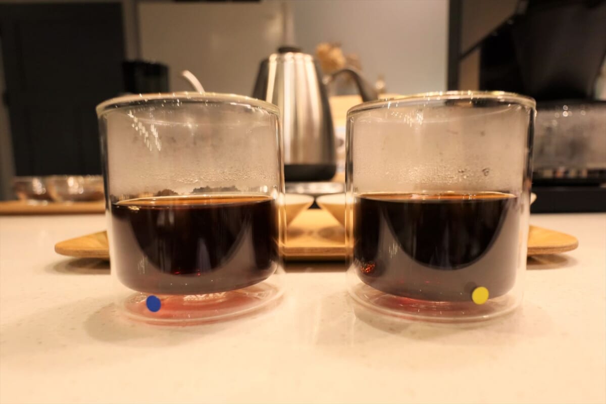 試飲会では、RCD-1で淹れた細挽きと極粗挽きの両極端な2杯が用意されており、これを試すことができました。細挽きは香りが強く、口に含むと苦味がガツンと来ます。のどを伝う濃厚なコクとともに鼻孔に抜けるアロマを感じると、深い充足感に満たされます。一方、極粗挽きは対極的で、香りは淡く、口当たりがよくてのどごしも良好。スッキリとした味わいは、朝食後の一杯に飲みたいところ。これは、どちらもイイですね!