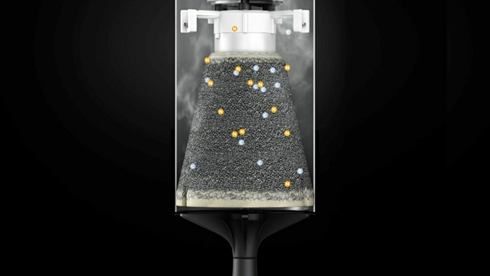 そんなナノドロンは、一般的な空気清浄機とは仕組みが大きく異なります。多くの空気清浄機は、本体下部から室内の空気を吸い込み、きれいになった空気を上部から吹き出します。しかし、ナノドロンは逆。上部から空気を吸い込み、静電フィルターに0.001μmまでの微粒子を吸着させ(これがどれだけスゴイかは後述)、1万2000Vの高電圧で有害物質を中和・除去します。さらに下部の二重層活性炭フィルターがニオイを中和し、イオン化空気に変えて下部から室内に供給するといいます。
