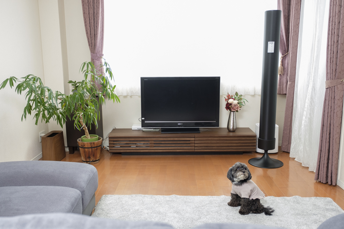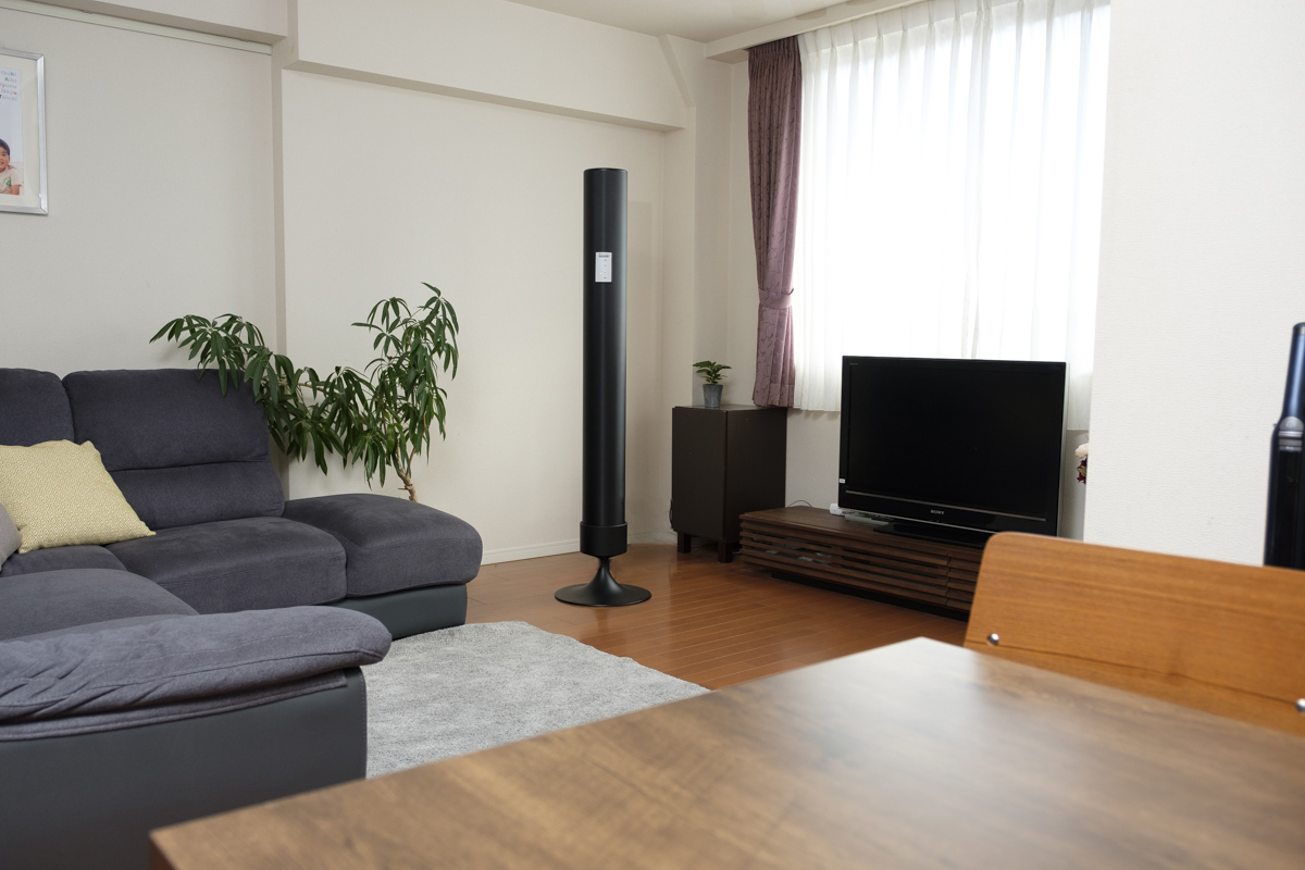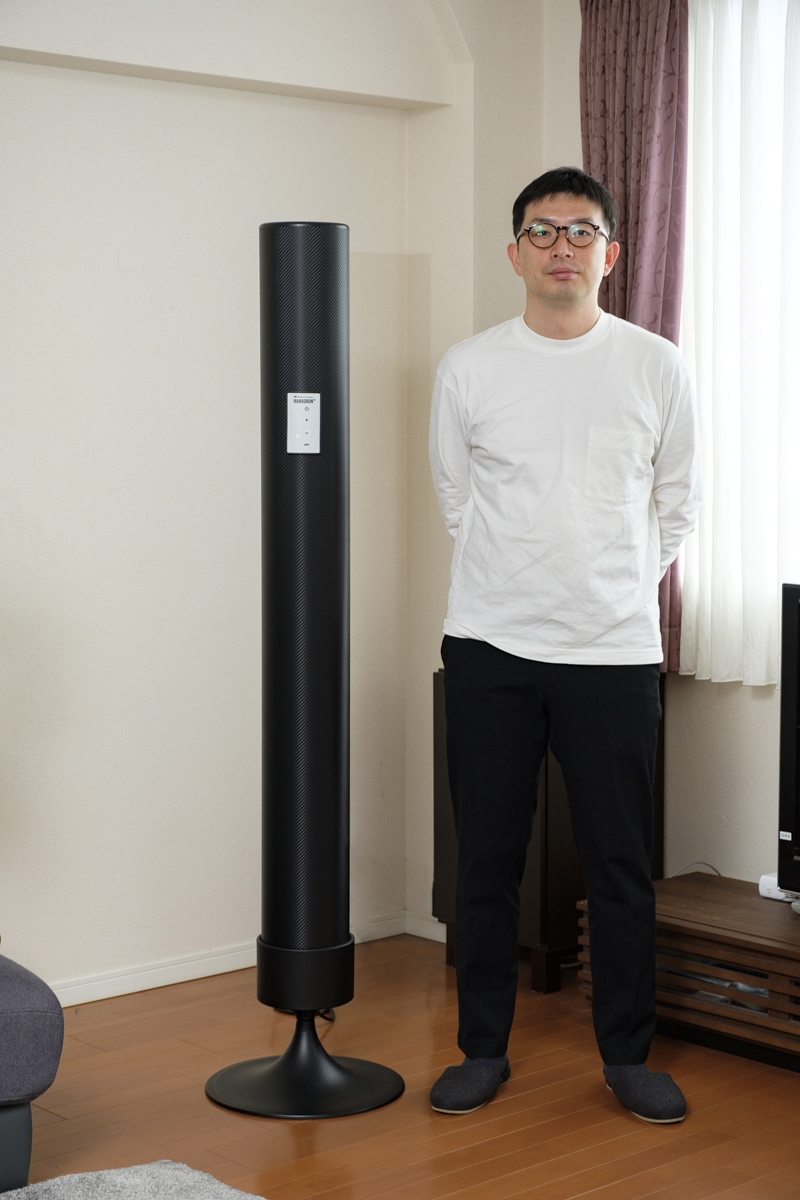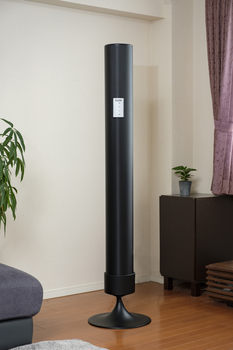 さて、そんなナノドロンの実力とはいかなるものか、わが家で10日間ほど使ってみました。お借りしたのは、凛とした黒が美しい「カーボンブラック」(80万円/税抜)。高さが165㎝と人の背丈ほどあるため、最初に見たときは「わが家には大きすぎるかも」と思いましたが、置いてみるとスリムなので意外に圧迫感はありません。むしろテレビとの雰囲気がマッチして、空間がよりスタイリッシュな印象になりました。