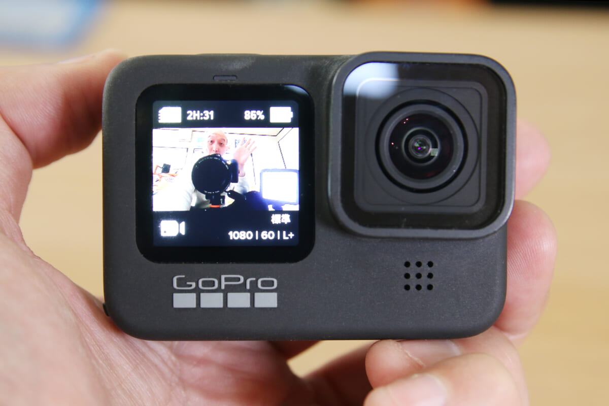 そしてついに真打ち登場! 待望の前面液晶を搭載した「GoPro HERO9 Black」が2020年9月に発売となりました。これでライブビューで画角を確認しながら確実に自撮りができ、Vlog用途にもかなり使いやすくなりました。しかも静止画/動画ともに解像度アップ。画質の良さは頭一つ抜きん出ている印象です。さらに新たに搭載された「リニア+水平維持」モードが非常に強力で、カメラが多少斜めになってしまっても記録映像は常に水平を維持してくれます。ジンバル要らずのスムーズな映像をカメラ単体で撮影できるんです。これだけでも驚きなのに、アクセサリー「Max レンズモジュラー」を使用すると360度どんな角度でも常に水平を維持してくれるんです。