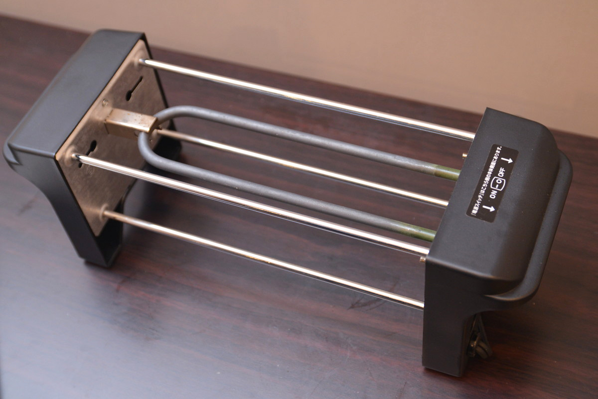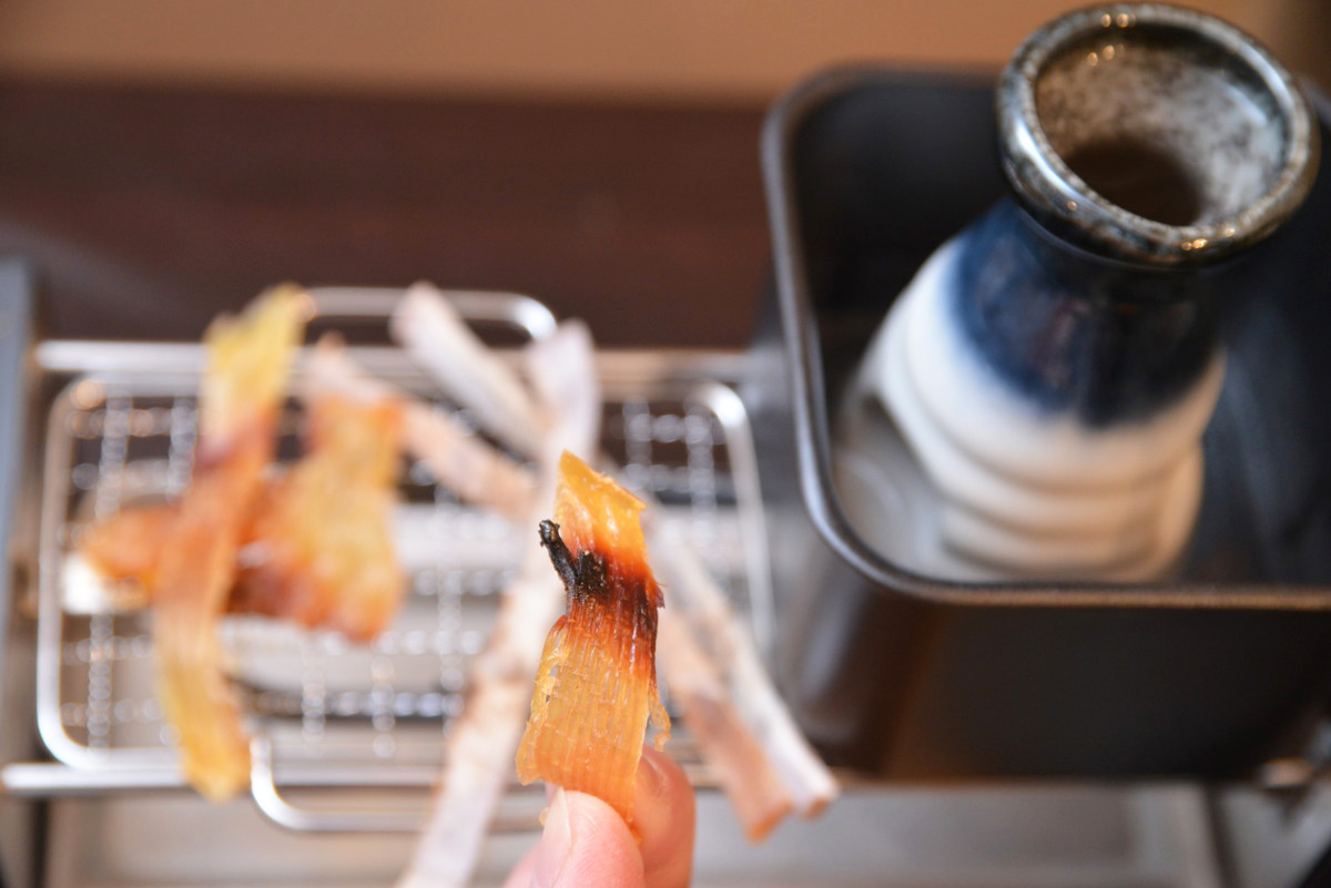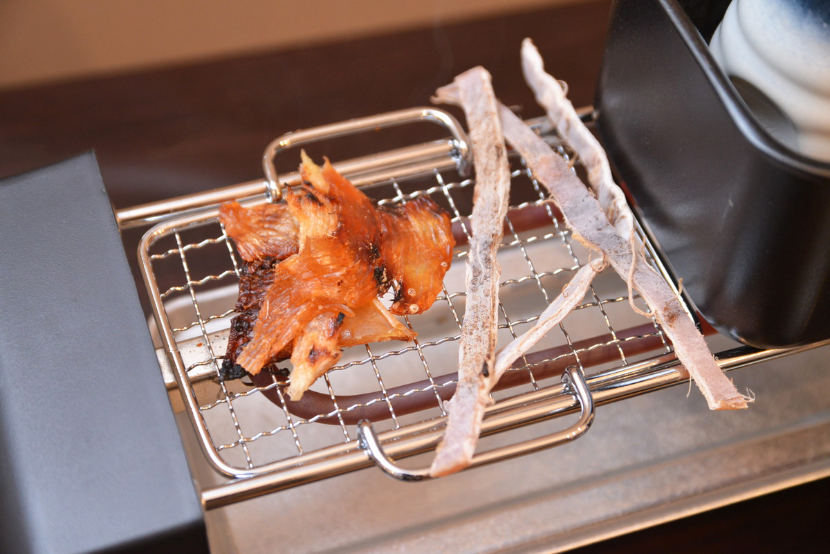 半分ほど水を入れた付属の熱燗鍋を本体にのせて、スイッチをONにして5分ほど予熱。酒を入れたとっくりを熱燗鍋に入れて待ちます。なお、熱燗鍋を使うとその脇にスペースが余るので、そこに炙り網を置いて、エイヒレとスルメイカを炙っていきます。