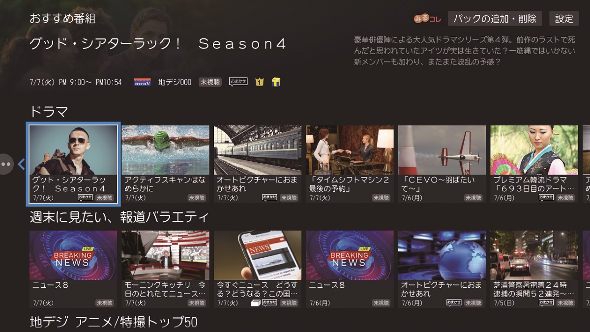 さらに、タイムシフトマシンや通常録画で録った番組をジャンルごとにサムネイル表示する「おすすめ番組」機能も搭載。ネット動画を選ぶようなUIで見たい番組を探すことができます。