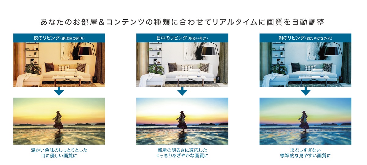 このほか、地デジ放送を4K解像度に変換して高画質で楽しめる「地デジAIビューティPRO II」や、ネット動画を高画質で再生する「ネット動画ビューティPRO II」などの高画質化機能も搭載。さらに、室内の明るさや光源の色温度の違いを測定し、自動で最適な画質に調整する「おまかせAIピクチャーII」が進化し、夜間の視聴時にはブルーライトを従来比で約40%カットします。