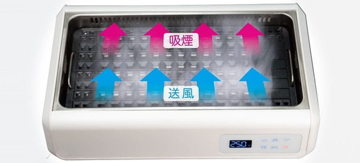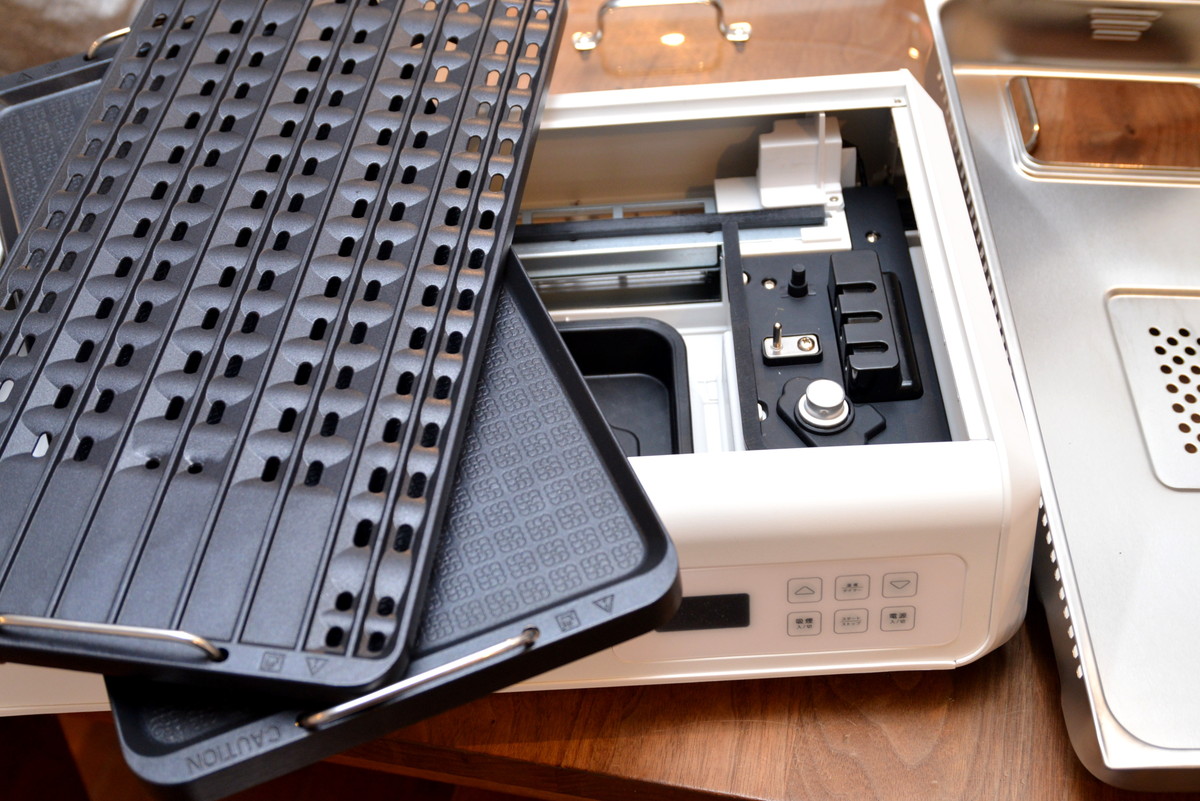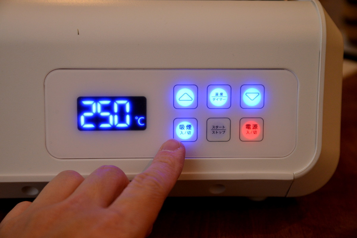 焼く際には前述の「吸煙 入/切」ボタンを押すのですが、オンにするとファンが回り「フォーン」と音がします。これはなかなか近未来的な新感覚で、テンションが上がりますね。なお、ジュージューと焼いている音の方が大きいので、ファンの音はそこまで気になるレベルではありません。