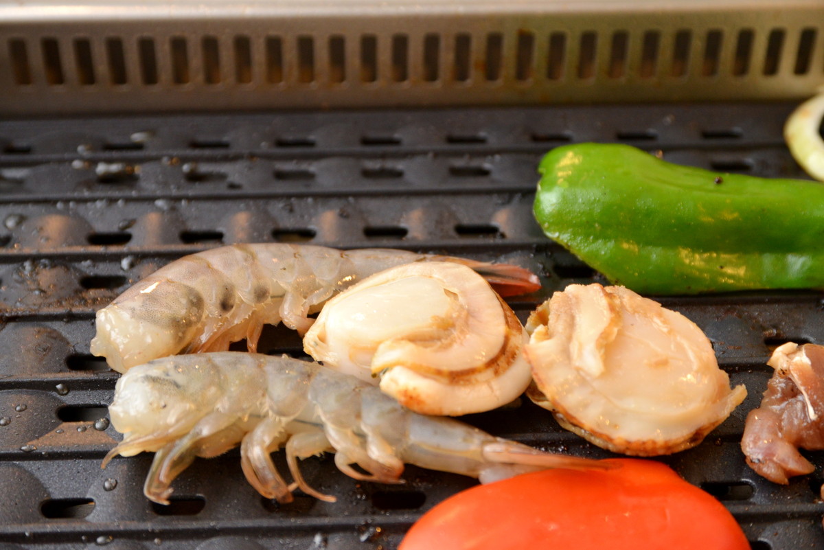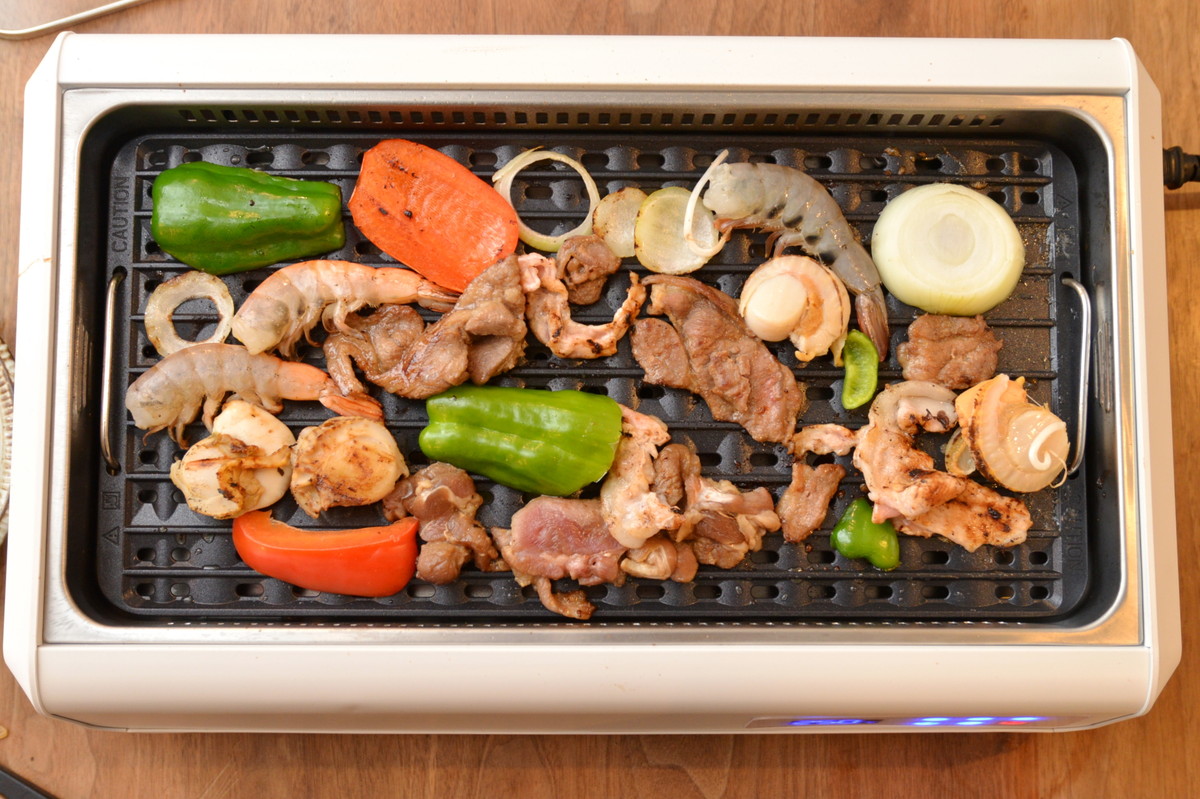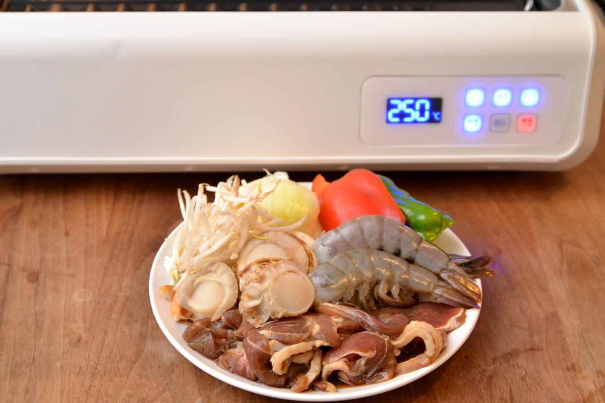 ここからは実践編。まずは焼肉で吸煙ファンの循環吸引を試してみます。食材は、煙が出やすい味付きの肉や魚介などを用意しました。