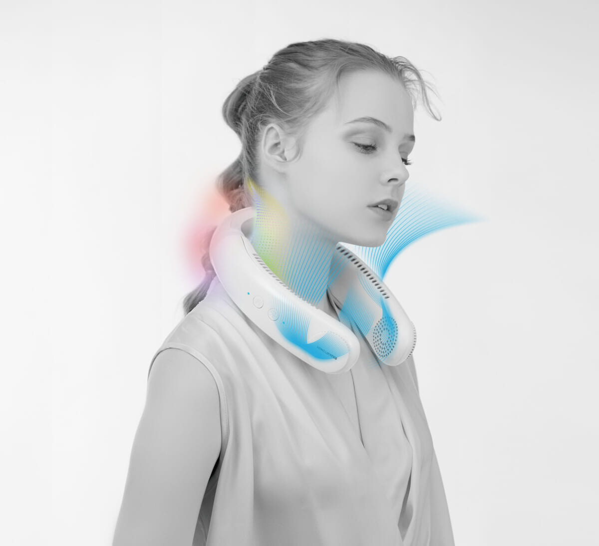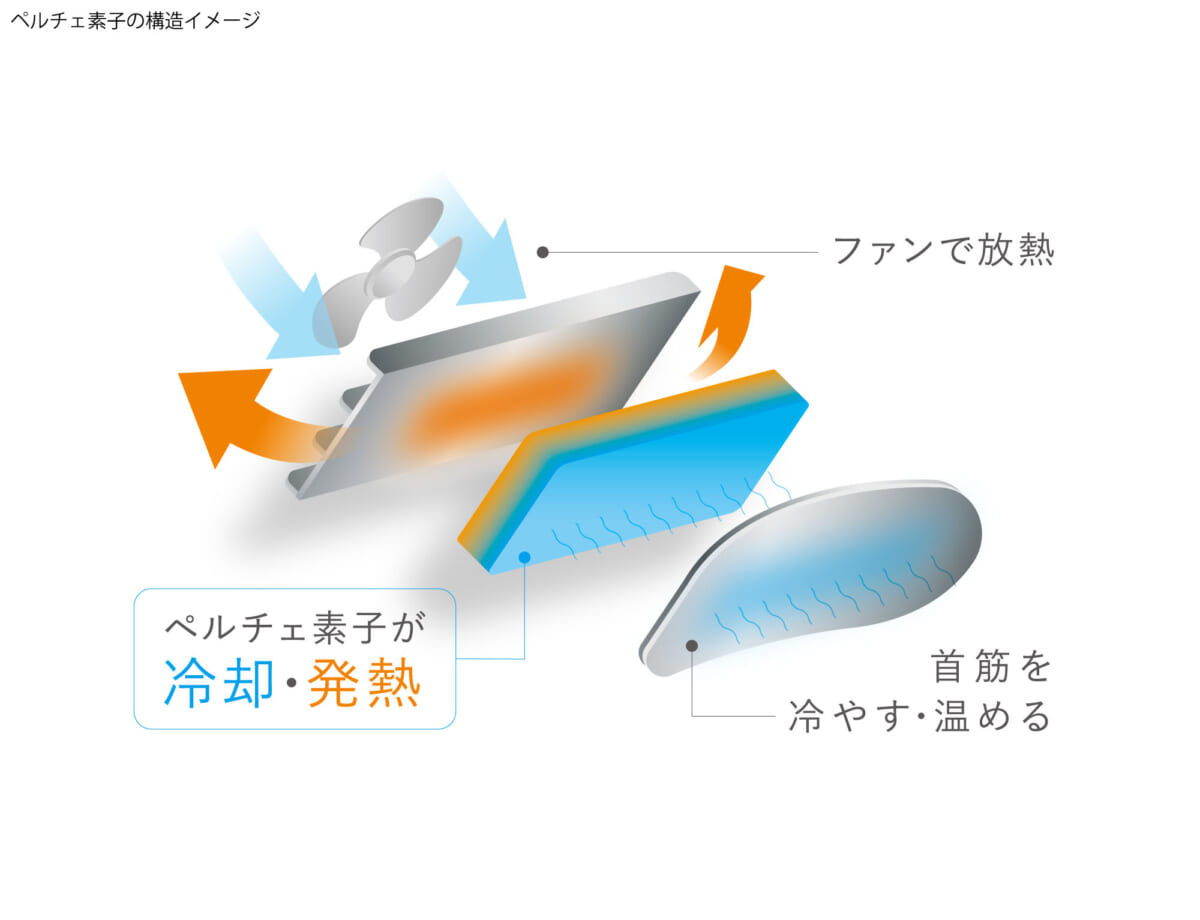 マッサージクッションブランド「ルルド」を展開するアテックスは、温度制御により発熱・冷却が行えるペルチェ素子とファンを搭載したハイブリッドタイプのネックアイテム「モノルルド ウェアラブル クールホット&ファン」を4月20日より発売。