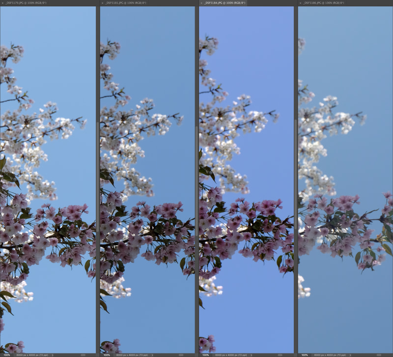 最後に桜の背景に欠かせない、空を青くする方法について検証してみました。1番カンタンなのはカメラのピクチャーモードをビビッドなどの鮮やか系にすることです。空だけでなく桜の花の色も鮮やかになります。カメラが自動的に補正してくれるので、何もしなくていい反面、補正が効きすぎてわざとらしい発色になる恐れもあります。