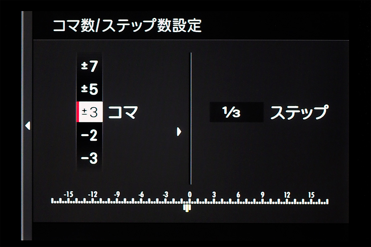 X-E3の場合は撮影設定のAEブラケティング設定から、コマ数とステップ数、補正の順番を指定できます。小平さんの設定は3コマ、1/3ステップで撮影順番はゼロ、+、−の順でした。撮影時はドライブモードでAEブラケティングを選択します。これでシャッターを1度押せば、指定された枚数で露出の異なるカットが連写されます。
