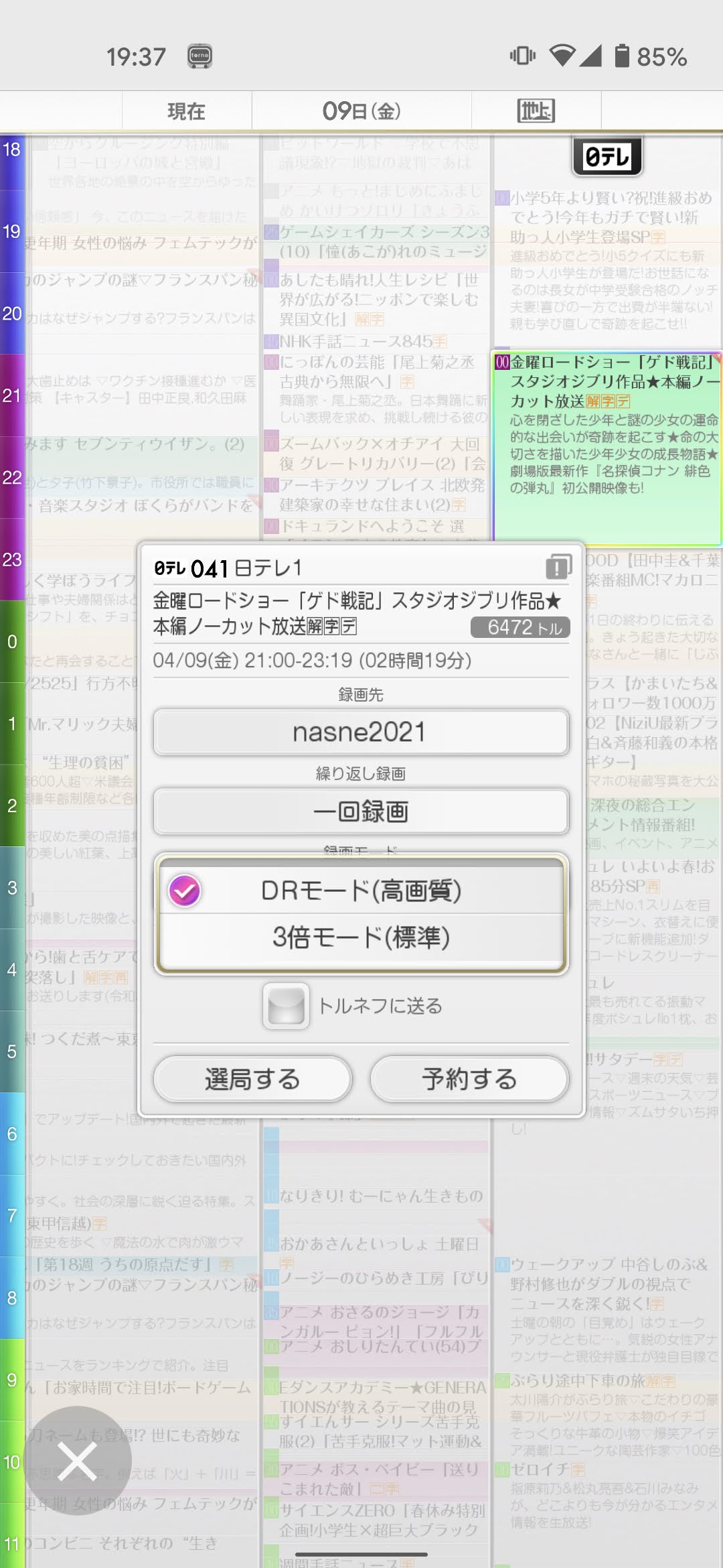 番組の録画予約もスマホから行うことができます。情報量が多いテレビ番組表はtonre mobileならではのキビキビした動作の強みが光るところで、時間帯・日付の移動や拡大・縮小などもかなりスムーズ。