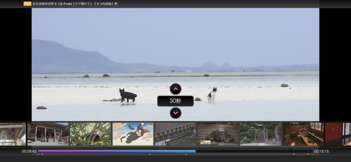 さらにイチオシはシーンサーチの機能。一定間隔(30秒、1分などで即切り替え可能)ごとのサムネイルをずらっと表示し、そこからシーンを選んでワンタップで再生できます。これは特番やワイドショーなど、長時間の番組から観たいシーンを探したいときに超便利。サムネイル表示のレスポンスも、「ネットワーク経由で観てるのにこんな速いの!?」と思わず感動するところです。