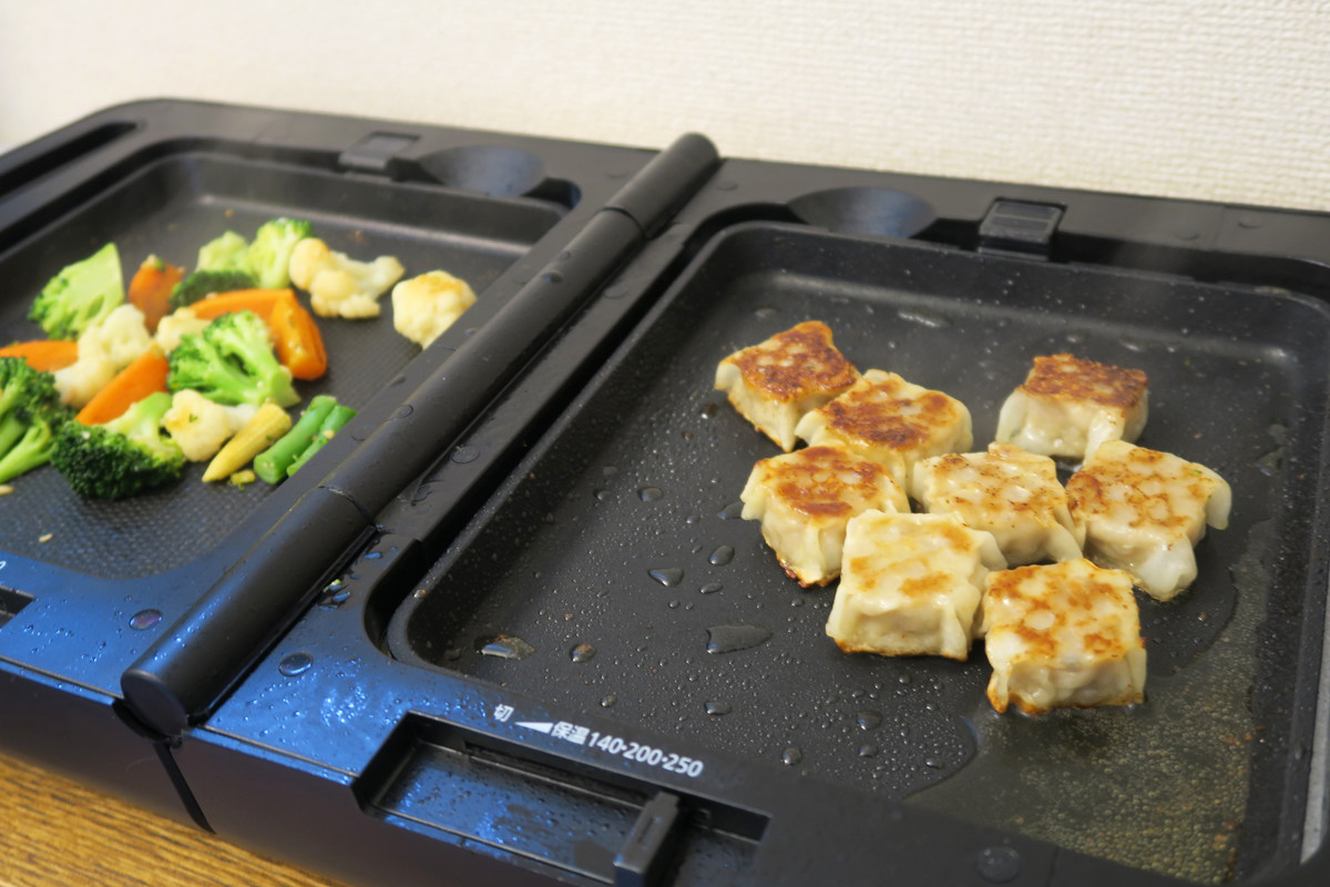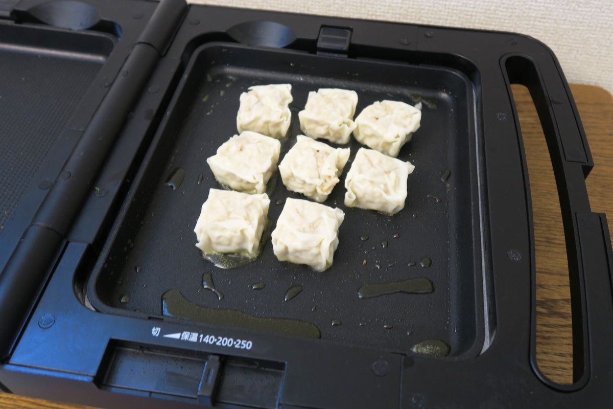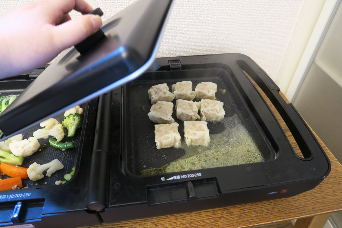 2面あるプレートはそれぞれ温度を調整可能で、保温(約80℃)のほか、140〜250℃の範囲で調節できます。クレープやホットケーキは約140℃、たこ焼き・お好み焼きは約200℃、焼き肉・ステーキなどの肉料理は約250℃で使うといいのだとか。今回は200℃でシューマイを蒸し、250℃で野菜ミックスを炒めていきます。