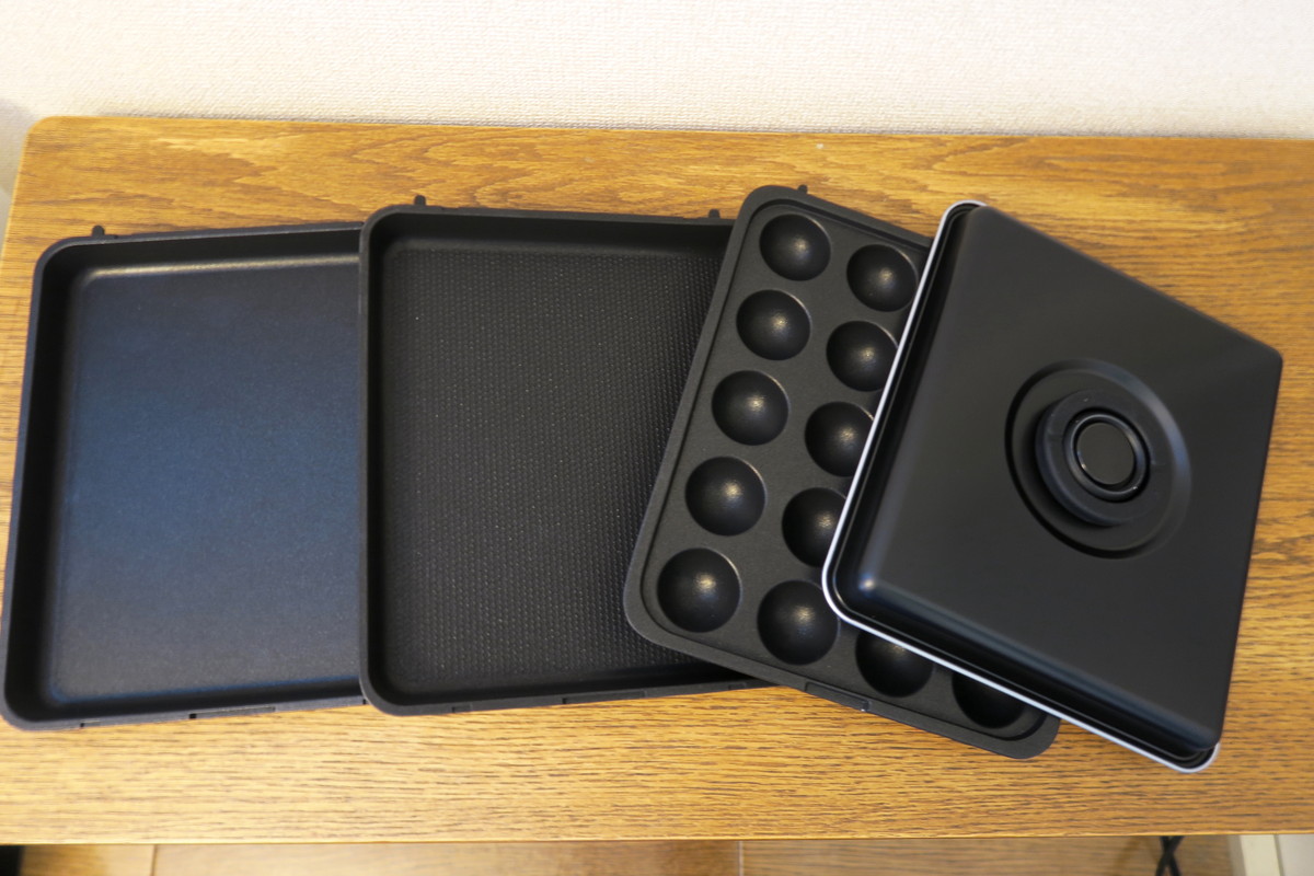 このホットプレートがいいのは、お好み焼きやホットケーキを焼くのにぴったりな「平面プレート」、アヒージョやケーキポップも作れる「たこ焼きプレート」、凹凸加工が施されて焦げ付きにくい「ディンプルプレート」の3枚が付属する点です。さらにフタが付属するのですが、この4点を本体に収納して片付けられるのも特筆すべきポイント!