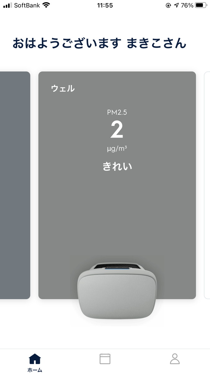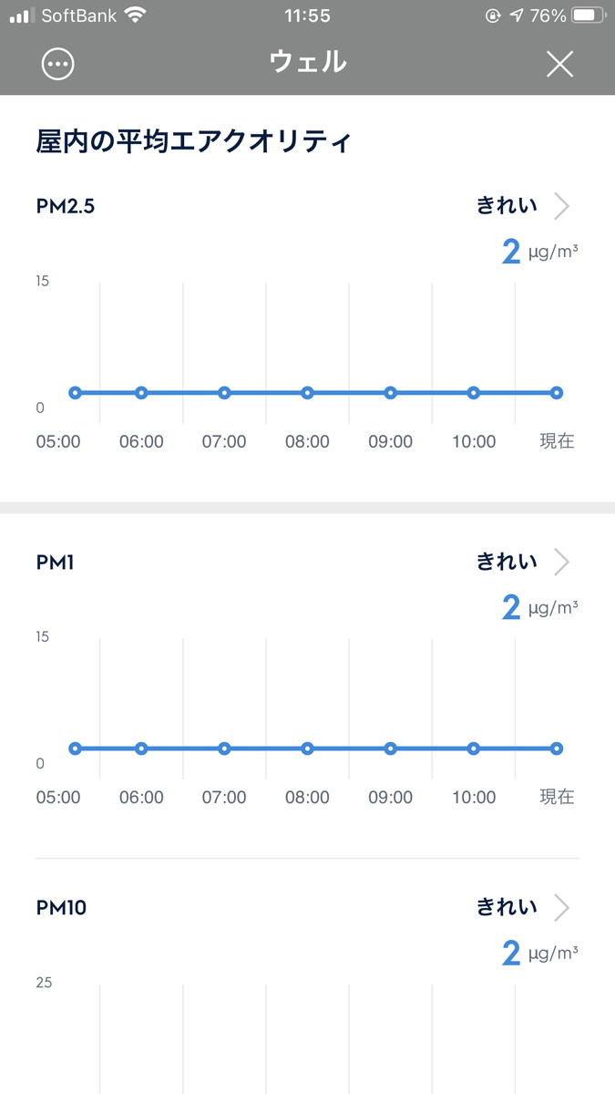 設置してしばらくはPM2.5が4μg /m3だったのですが、2μg /m3に減っていたので、効果が出ているようです。こうして見ると、Well A7が常に部屋をキレイにキープしていることがわかりますね。これなら在宅中はもちろん、外出時に家の様子がわかって安心。もし空気が汚れているようなら、アプリ操作で運転を少し強くしておけば、空気がキレイな部屋に帰宅できますね。