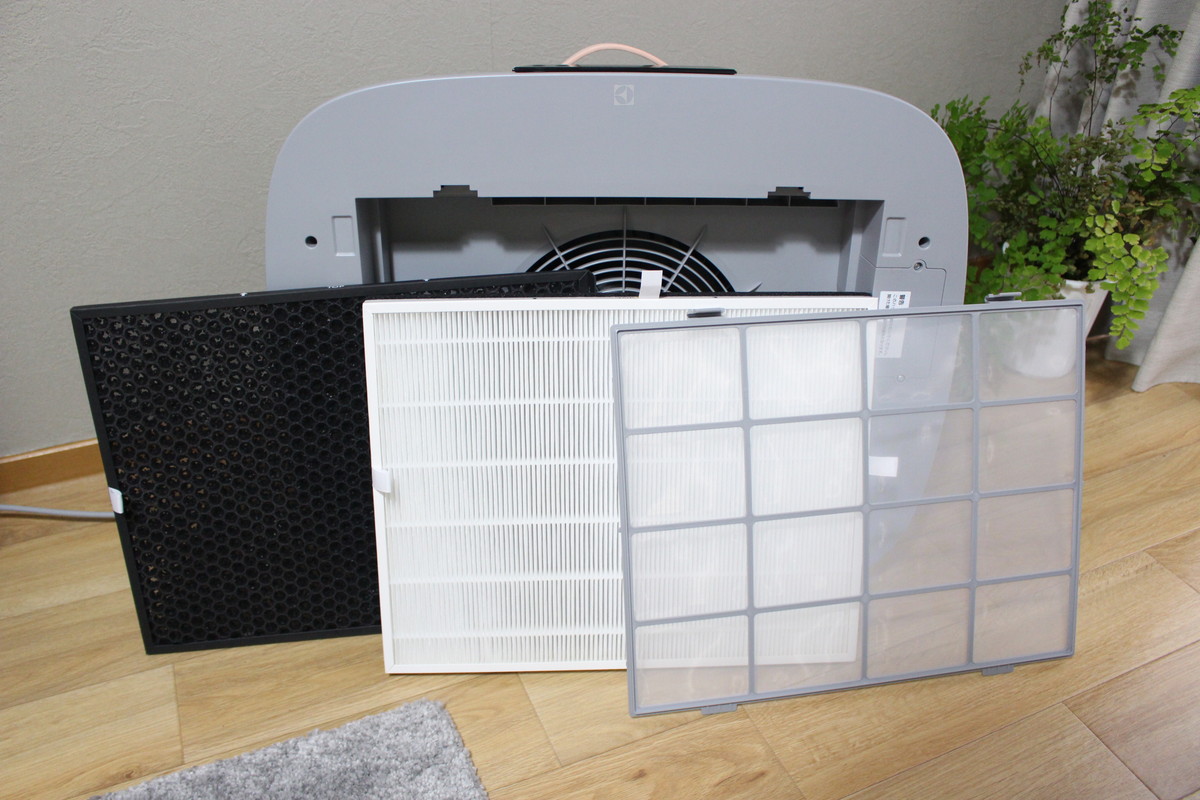 外見はファブリック調フロントパネルに、革製の取っ手と、一見するとバッグのようにも見え、家電っぽさは一切ありません。とはいえ、おしゃれながら高性能なのがエレクトロラックスの持ち味。フロントパネルを外してみると、3枚のフィルターが現れました。
