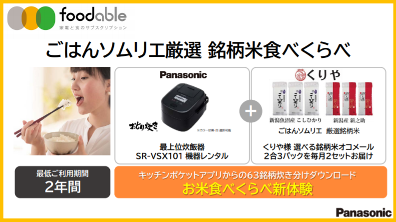 また、これまで試験的に導入していたサブスクリプションサービスを「foodable」として4コースで本格展開。全コース一律月額3980円(税・送料込み)のお手軽な料金で、パナソニックの最新家電レンタルと食材の定期宅配を組み合わせたサービスを受けることができます。