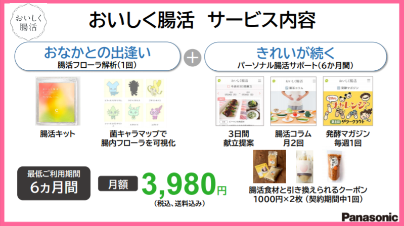 また、インナービューティの向上を目指す「おいしく腸活」サービスでは、腸内フローラ解析サービスを提供するサイキンソーと協力し、自分の腸内環境を見える化した上で、日々の食事を記録に残せる食のパーソナルカレンダーや献立ナビなどの情報を提供。さらに、腸活食材と引き換えられるクーポンなどももらえます。こちらも月額3980円(税・送料込み)。