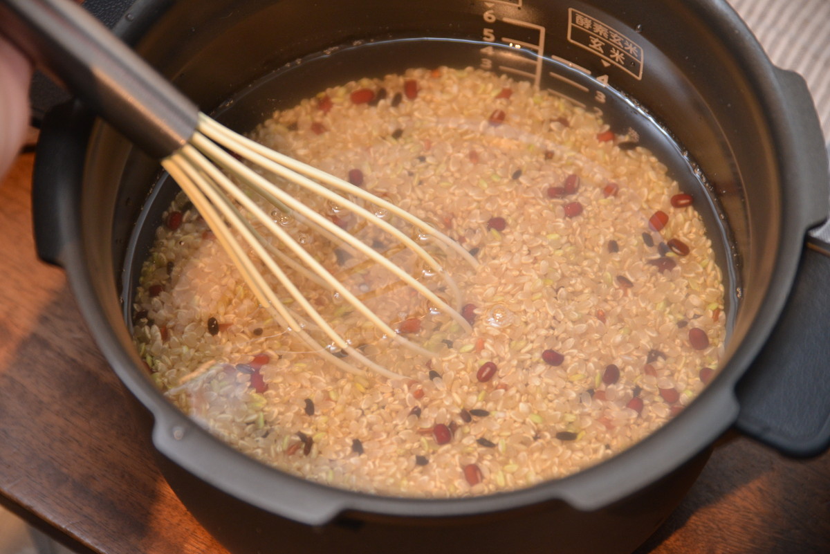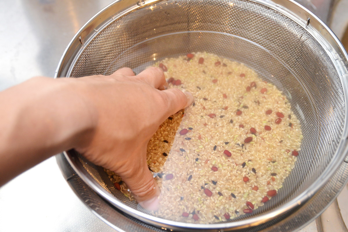炊き方は、まず計量して洗米。玄米と「にじいろ酵素玄米ミックス」を一緒に洗います。このときによくすすぐことで、玄米特有の匂いがなくなりおいしさが増すとのこと。
