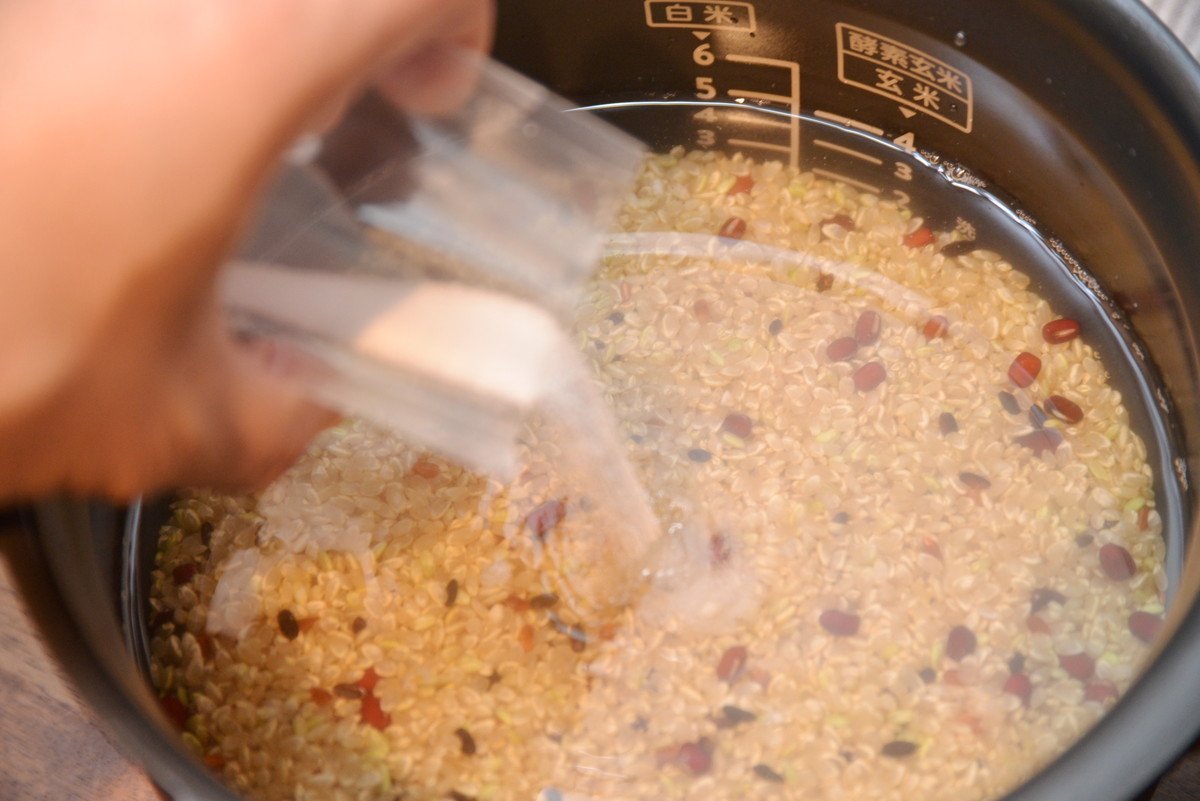 米を研いで、水を適切なラインまで入れるのは一般的な炊飯器と一緒。そのあとに塩を入れる工程が、酵素玄米作りには欠かせません。なお、この塩は酵素玄米のためのオリジナル製品で、玄米と小豆のおいしさを引き出し、ミネラルバランスをとる目的があるとのこと。