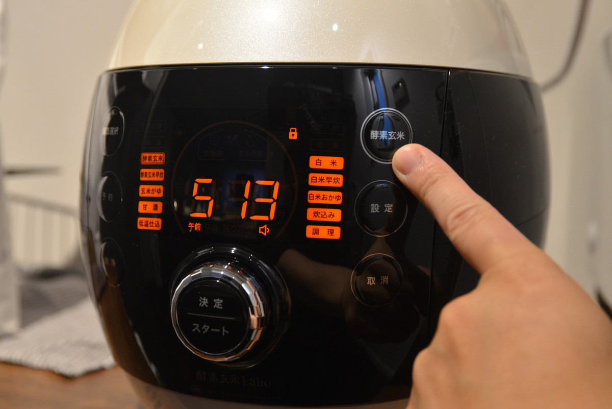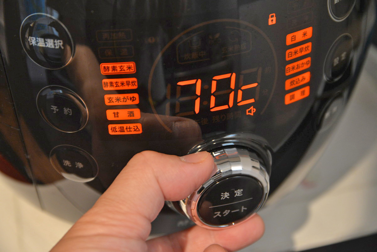 あとは電源を入れてボタンを押すだけ。炊飯のモードは「酵素玄米」のほか、「酵素玄米早炊」「玄米がゆ」「白米」「白米早炊」「白米おかゆ」「炊込み」など多彩にラインナップ。もちろん酵素玄米のほか、普通の白米も炊けます。また、予約の設定をして玄米を炊くと、よりやわらかな食感の発芽玄米ごはんを作れます。