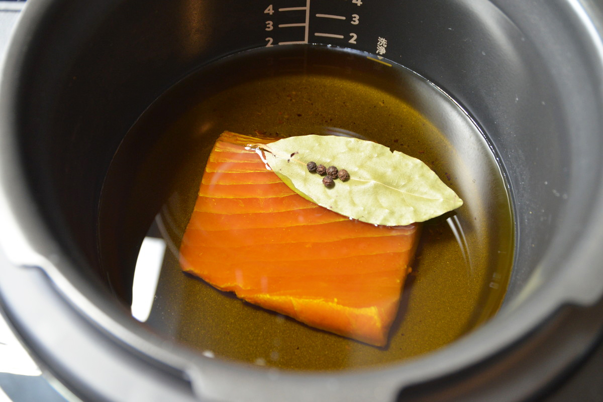 水分を拭き取り塩を振ったマグロを冷蔵庫で30〜60分寝かせ、再度水分を拭き取ったら内鍋へ。身がひたるまでオリーブオイルを入れ、ローリエとブラックペッパーの粒を入れたら準備完了です。炊飯器のフタをし、ダイヤルで「低温仕込」モードを選び70℃で1時間に設定。「決定/スタート」ボタンを押せば調理が始まります。