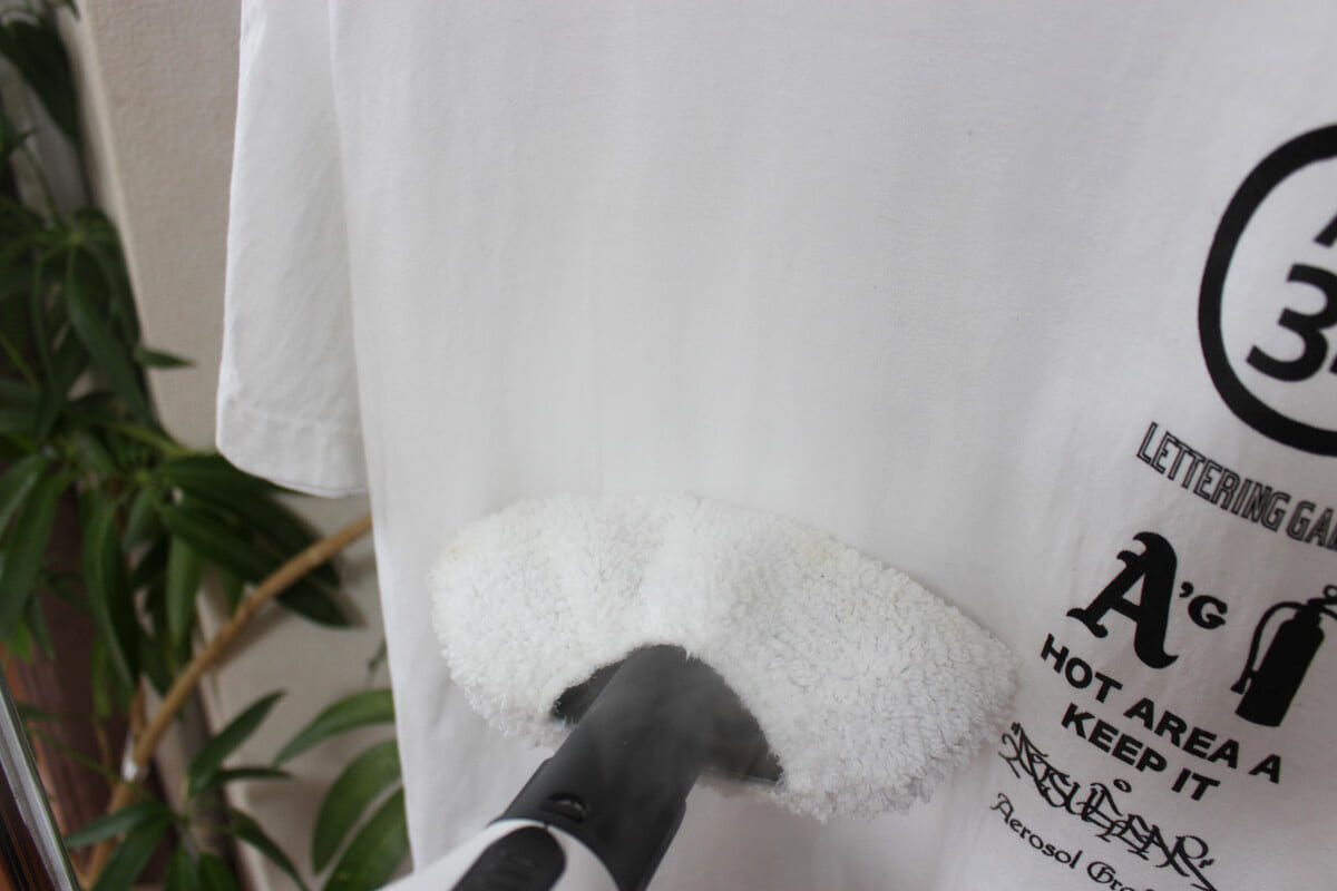今回、ちょっと試してみたいことがありました。なんと衣類のシワ伸ばしにも使えるというのです。確かに100℃のスチームがたっぷり出るならシワ伸ばしにはうってつけ。目からウロコです。さっそくTシャツのシワを伸ばしてみると、これまたびっくり! 普通の衣類スチーマーより格段にシワが伸びました!