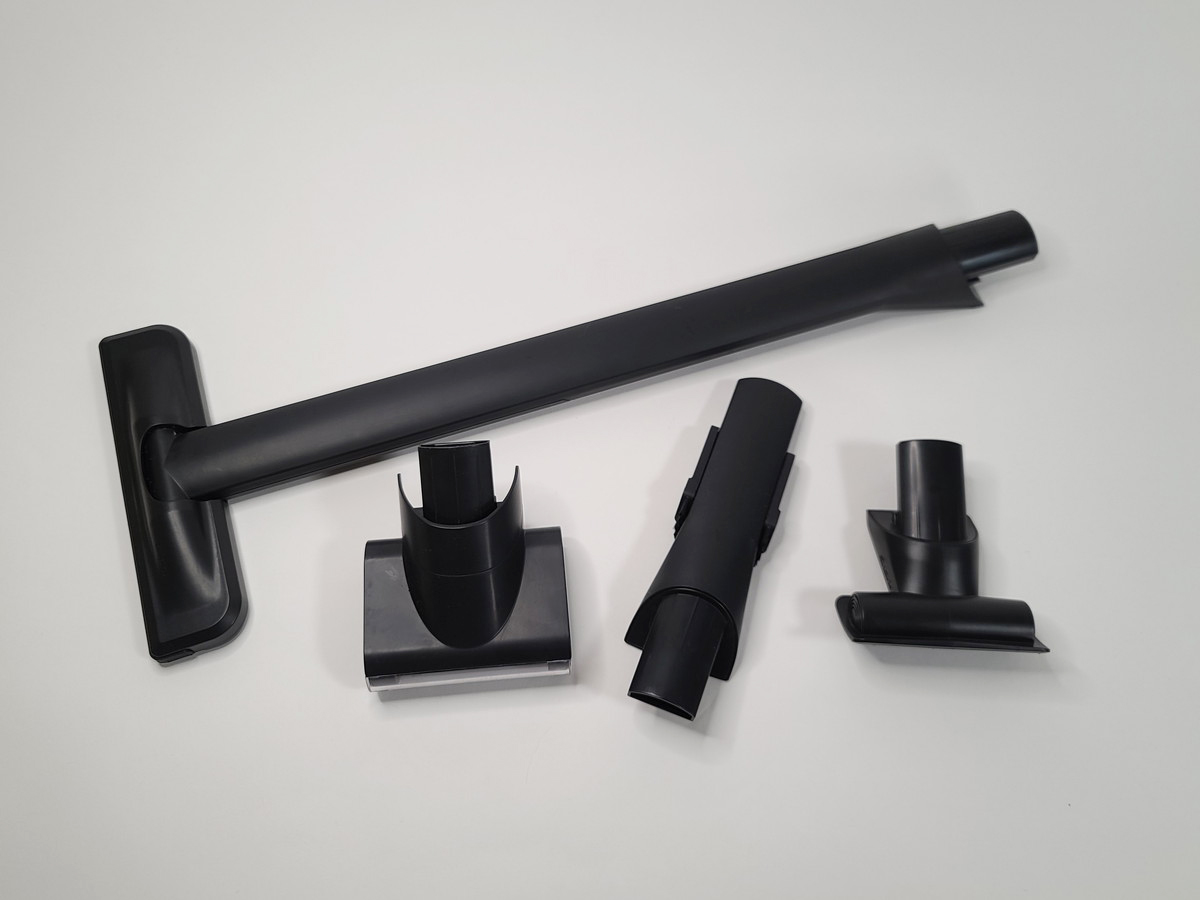 先述の通り、3つのカラーによってアクセサリーが違います。アクセサリーのなかでも筆者が注目していたのが、最上位機種にのみ付属するフローリング用延長ノズル。なんと、これを装着することで、ハンディクリーナーからコードレスクリーナーになるのです! とはいえ、実際に使ってみると延長ノズルを利用すると吸引力はかなり落ちる印象。広い範囲をざっくりと掃除するのには良いですが、しっかり床掃除をしたいならコードレススティック掃除機を別に用意したほうがよさそう。あくまでサブ掃除機として利用するのがオススメです。