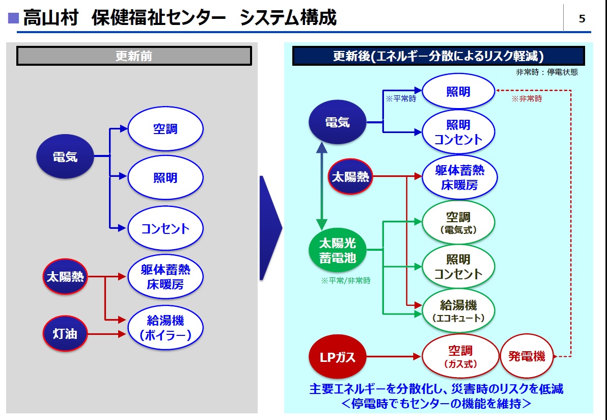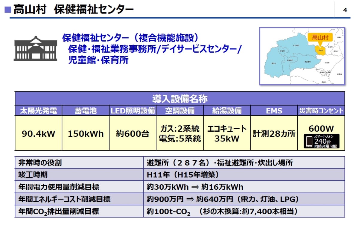 例えば、高山村の保健福祉センターでは、冬の寒い時期に出勤してすぐに暖かい状態で働けるよう、夜間から床暖房の予熱を8時間も行っていたところ、予熱スタートから4時間後に保温動作に入っており、ムダな電力を使用していたことが「Emanage」によって判明。予熱時間を大幅に短縮して電気代の削減を実現しました。さらに、災害発生時には、地元の電気工事共同組合との協定により、パナソニック・ライフソリューションズが電気設備の点検と要員の確保・配置、損壊箇所の応急措置・復旧工事も担います。