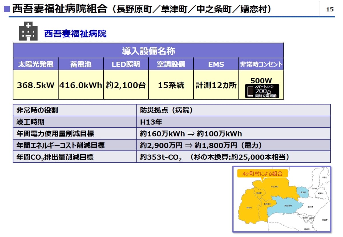 最後に、西吾妻福祉病院を視察してきました。同院は長野原・草津町・中之条町・嬬恋村の4町村共同出資により運営されている公営の総合病院で、24時間365日体制で救急対応し、ドクターヘリのヘリポートも装備。病床数は74床。総合病院ゆえに自家発電設備(重油)を備えており、緊急時には手術室やICUといった重要棟や生命維持装置などの医療機器に優先して電力を供給する体制を敷いています。そのため一般病棟は保安灯のみで暗く、不便を感じていたといいます。