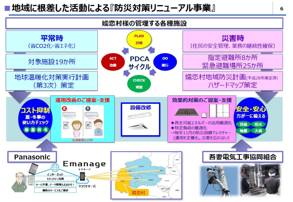 吾妻郡におけるこれらの防災対策リニューアルは、パナソニック・ライフソリューションズが中心となって行われました。冒頭に説明した国の補助事業の紹介から手続きのサポート、システム・設備の設計・施工、供用開始後の運用面でのサポートも同社が一手に担っています。平常時は太陽光発電と蓄電の状況、電力の使用状況をエネルギー・マネジメント・システム「Emanage(エマネージ)」により遠隔監視し、定期的にレポート、および改善提案をしています。