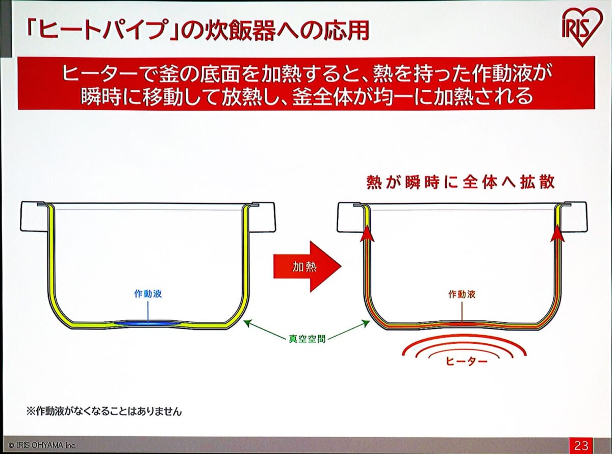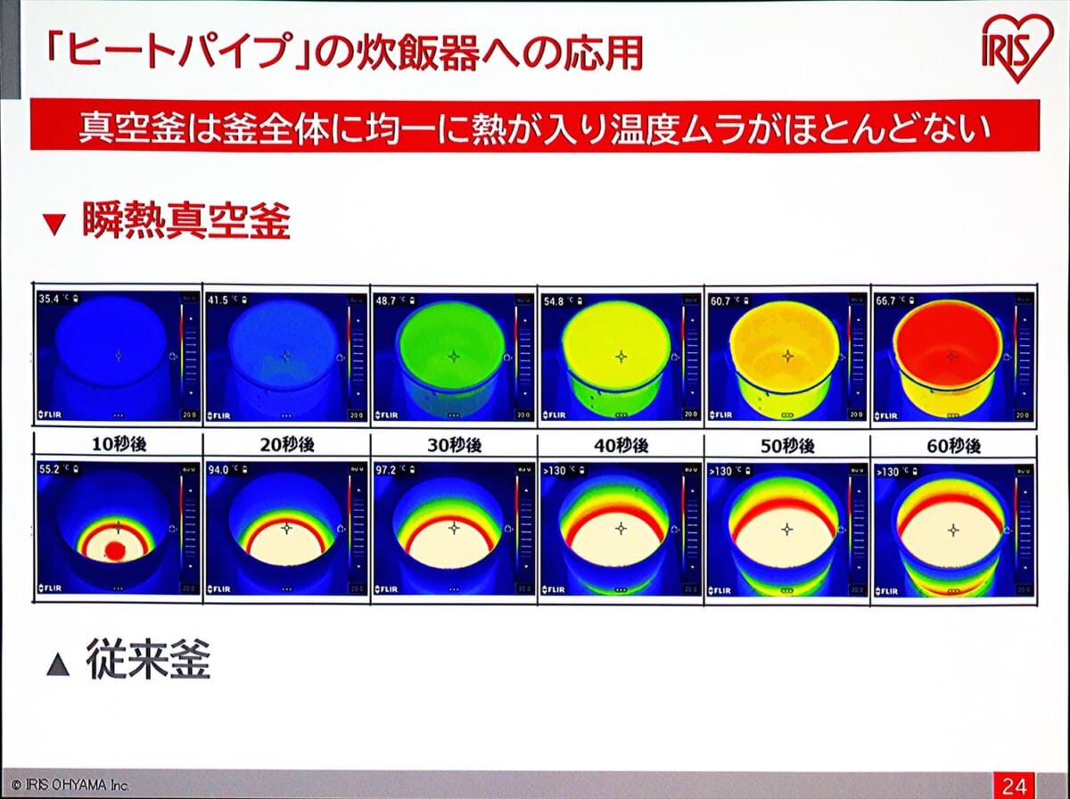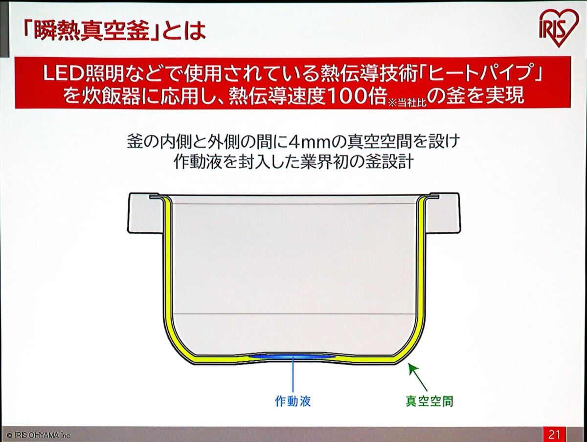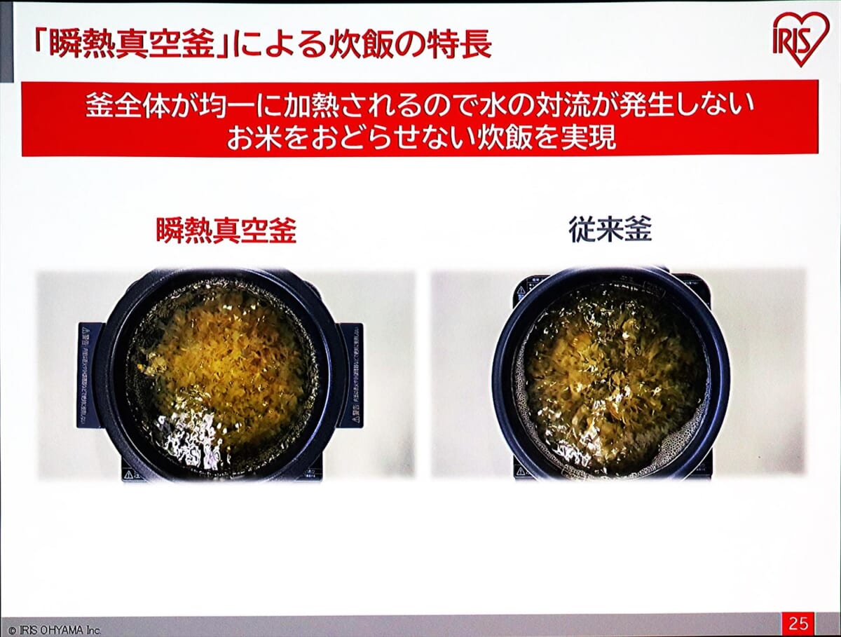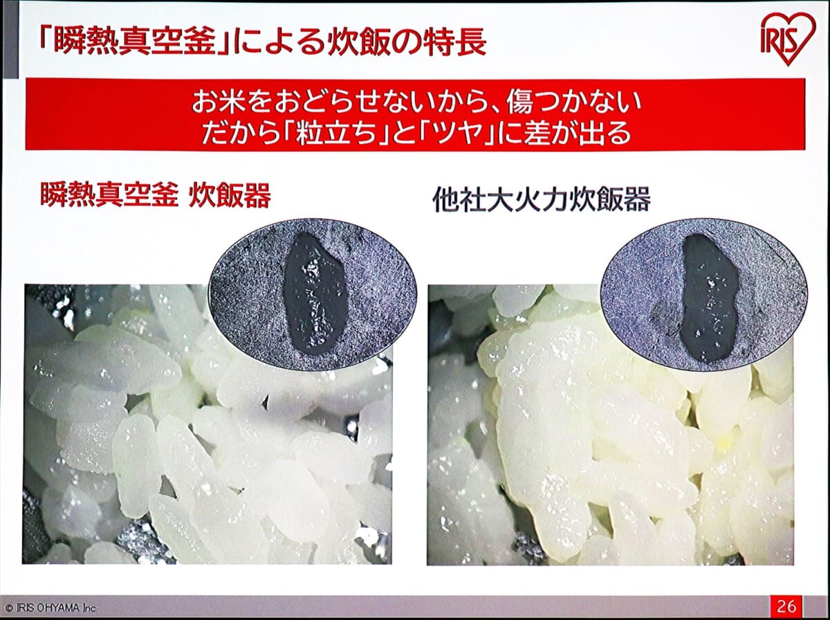 「瞬熱真空釜」により、釜全体に素早く熱を伝えることができるようになり、釜内部で対流を起こさなくてもムラなくごはんが炊けるようになりました。米が踊らないから米に傷がつかず、粒立ちとハリ、ツヤが保たれ、見た目から美味しそうに炊きあがるとのことです。