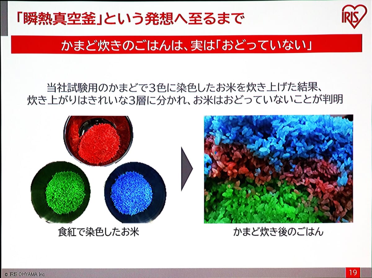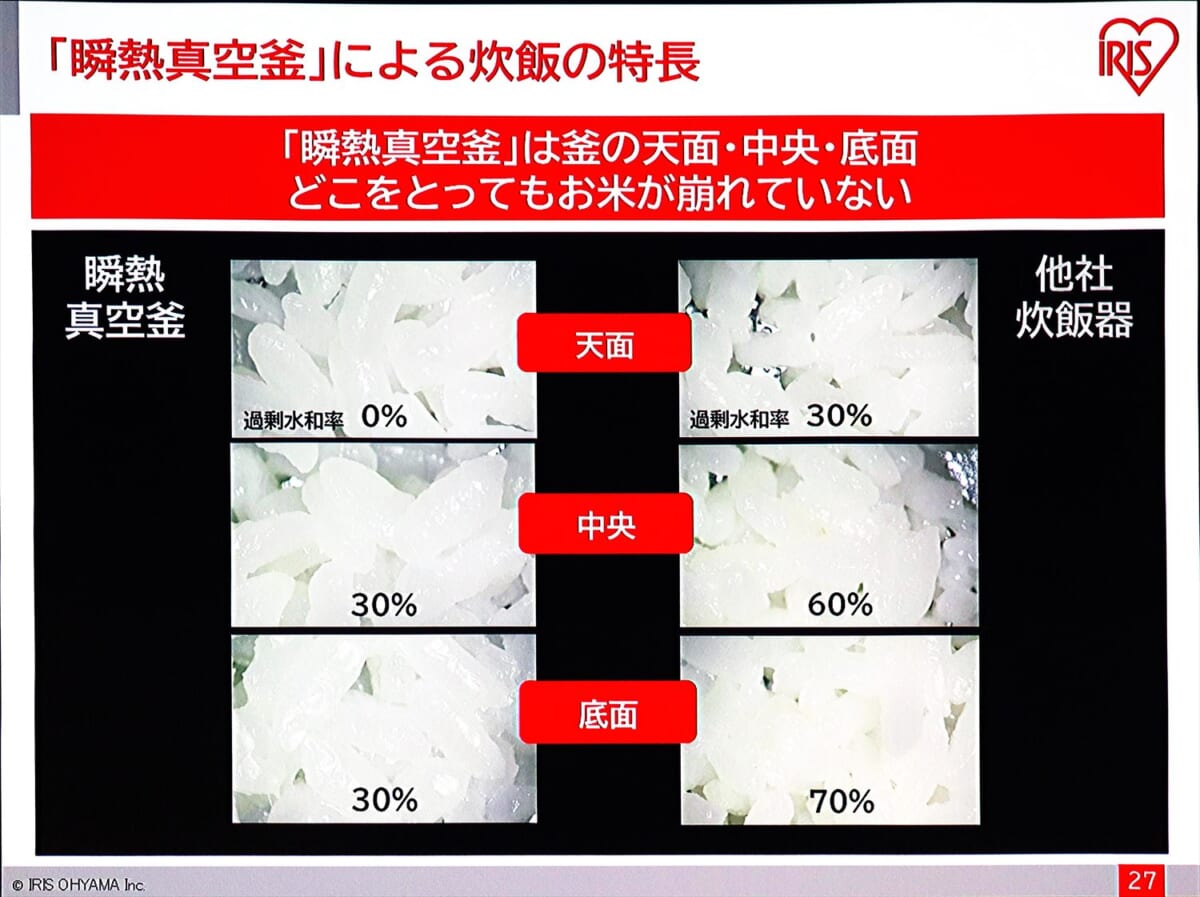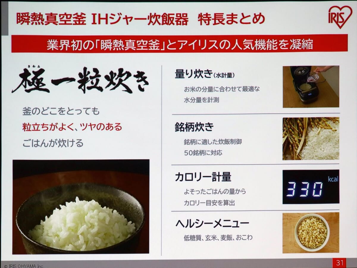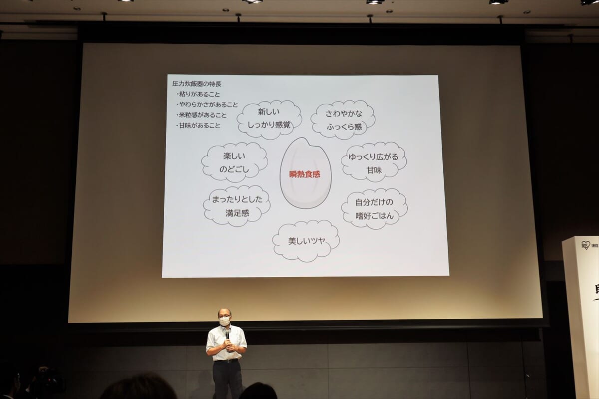 今回は、コロナ禍の影響により発表会での試食がなかったので、実際にどんな味、食感がするのかを体験できなかったのは残念なところ。西島氏が「これまでにない、言葉で表現できない新しい食感。ぜひ買って食べてみてほしい」と絶賛するので、期待値が相当上がっています。アイリスオーヤマでは、「同社史上もっとも自信のある製品が完成したことで、これまでにない規模のプロモーションを仕掛けていく」とのこと。コロナ禍が落ち着いたら、ぜひ試食したいですね。特に東北産の米で炊いたごはんを早く食べてみたいものです。