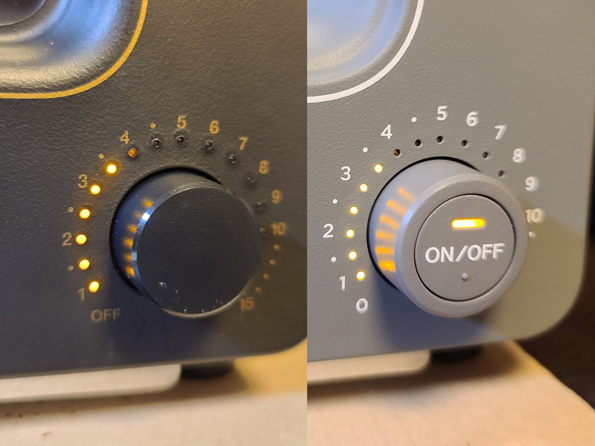 一目でわかる違いは操作部。モード切替表示が「どのモードを選んでいるか」がひと目でわかるデザインになり、主操作部はボタン中央に「電源ON/OFF」のボタンが付きました。BALMUDA The Toasterは旧モデルの完成度が高く、現在も旧モデルを売っている店がありますが、新旧の違いはダイヤルに電源ボタンがついているかどうかでチェックすると間違いありません。